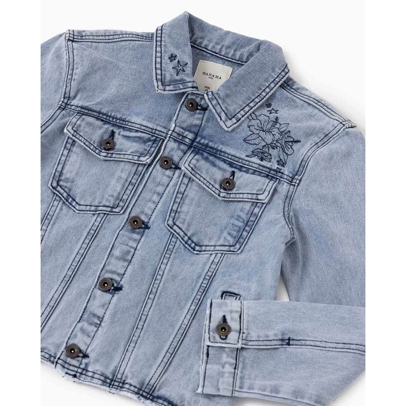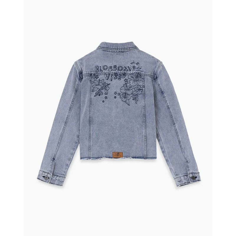 Campera jeanera confeccionada en denim 100% algodón. Posee terminacion al corte, sin cintura. Calce regular. Bordados en cuello, frentes y espalda especialmente diseñados para la capsula. Lavado claro. Nos encanta combinarla con toda la colección.