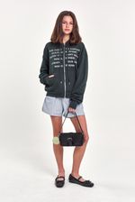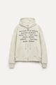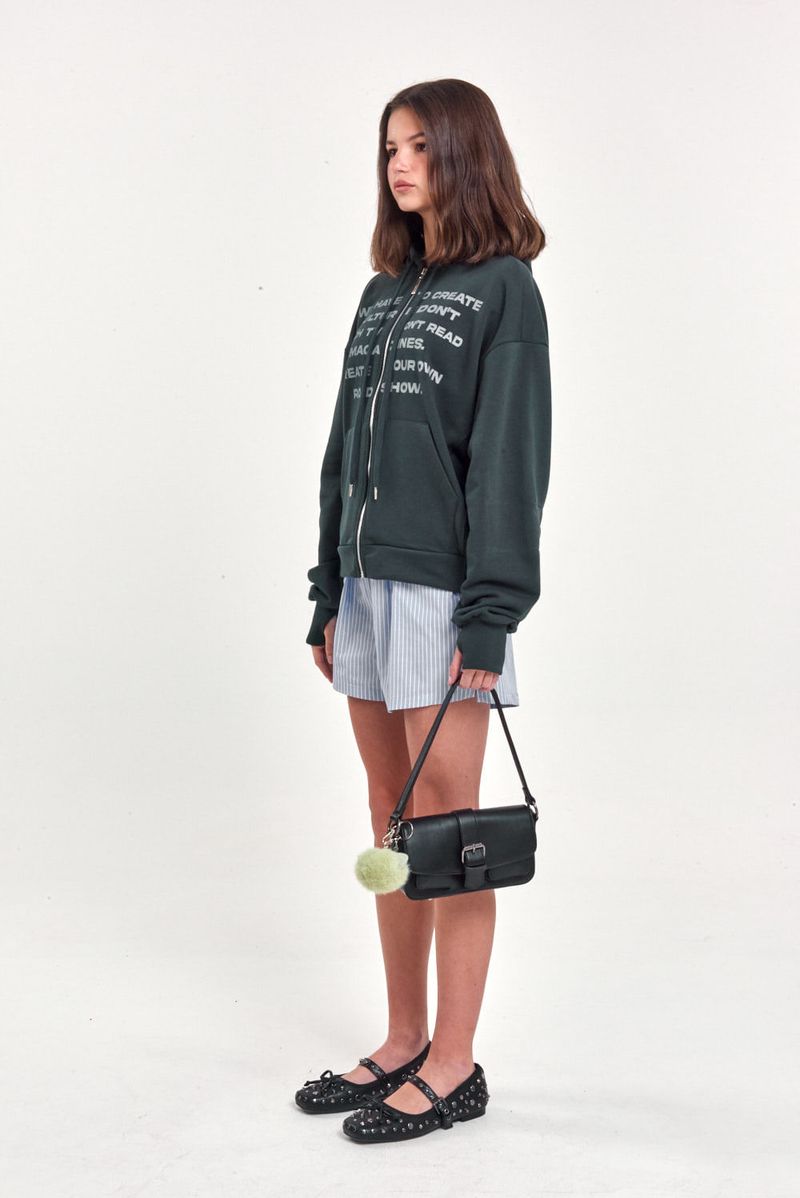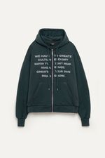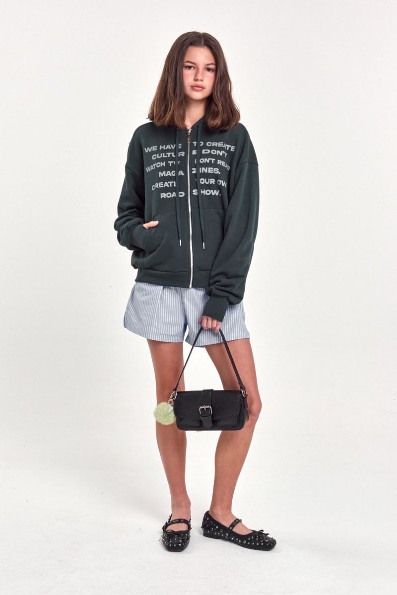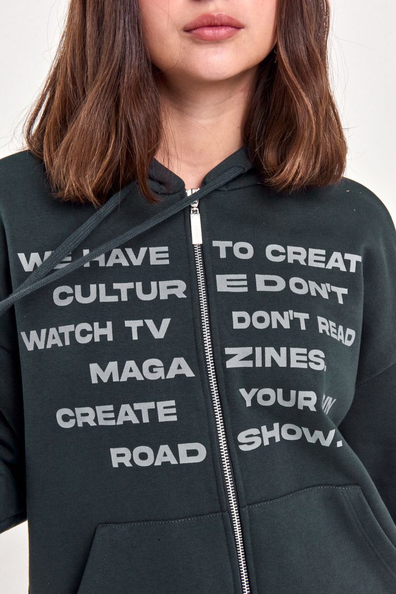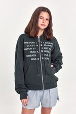 Campera de rústico pesado con capucha y bolsillo canguro. Estampa frontal con mensaje y cierre metálico al frente. Ideal para sumar estilo con jeans rectos o pantalones cargo.