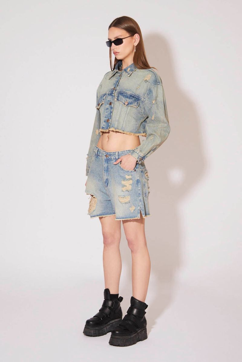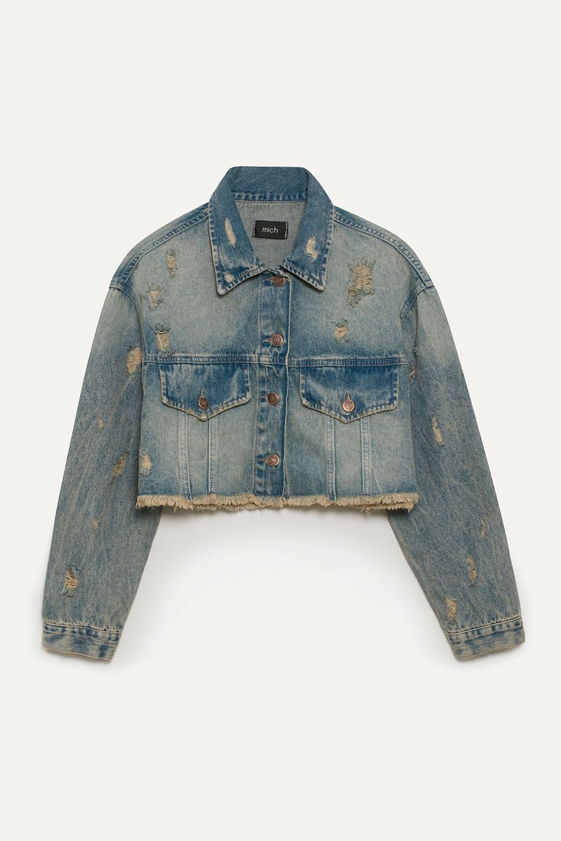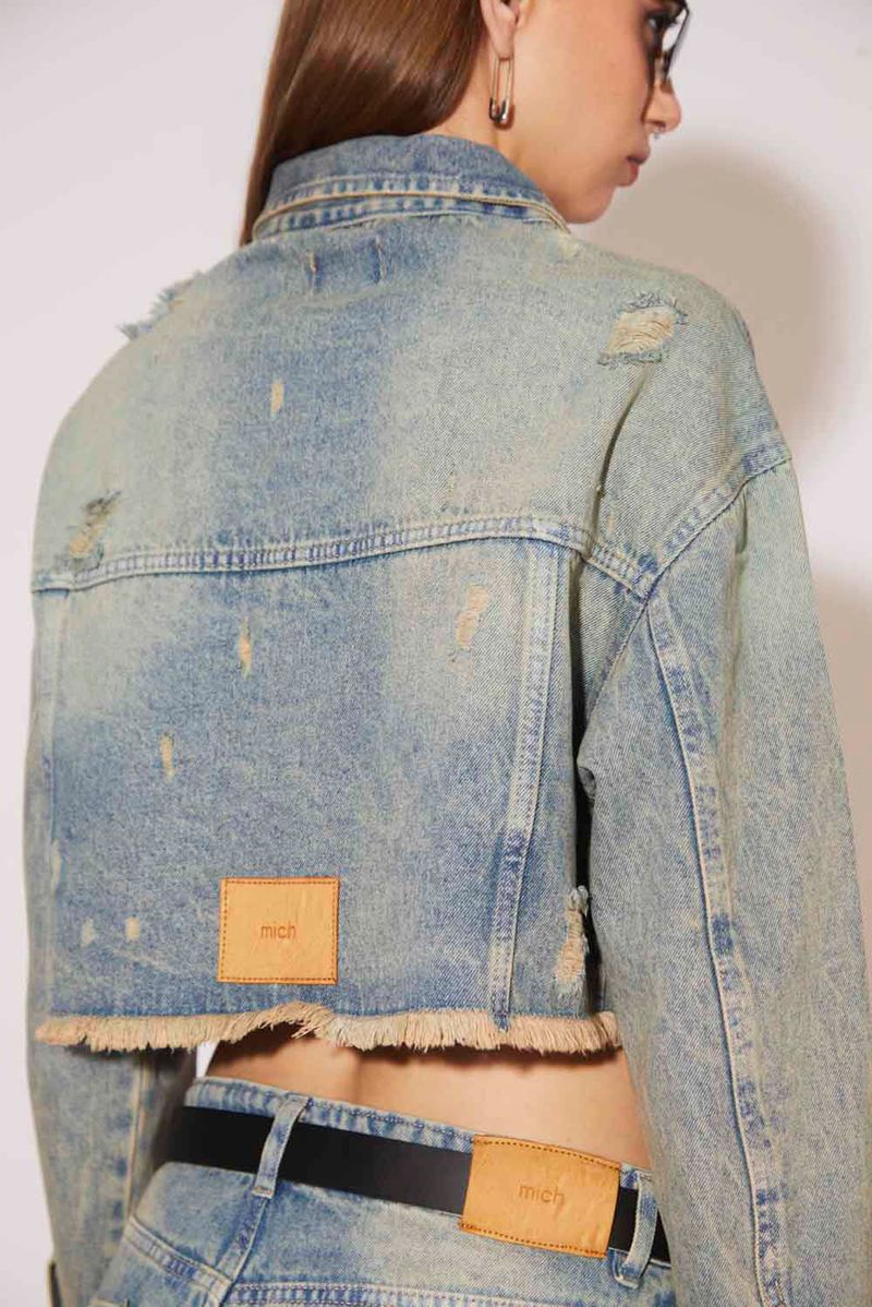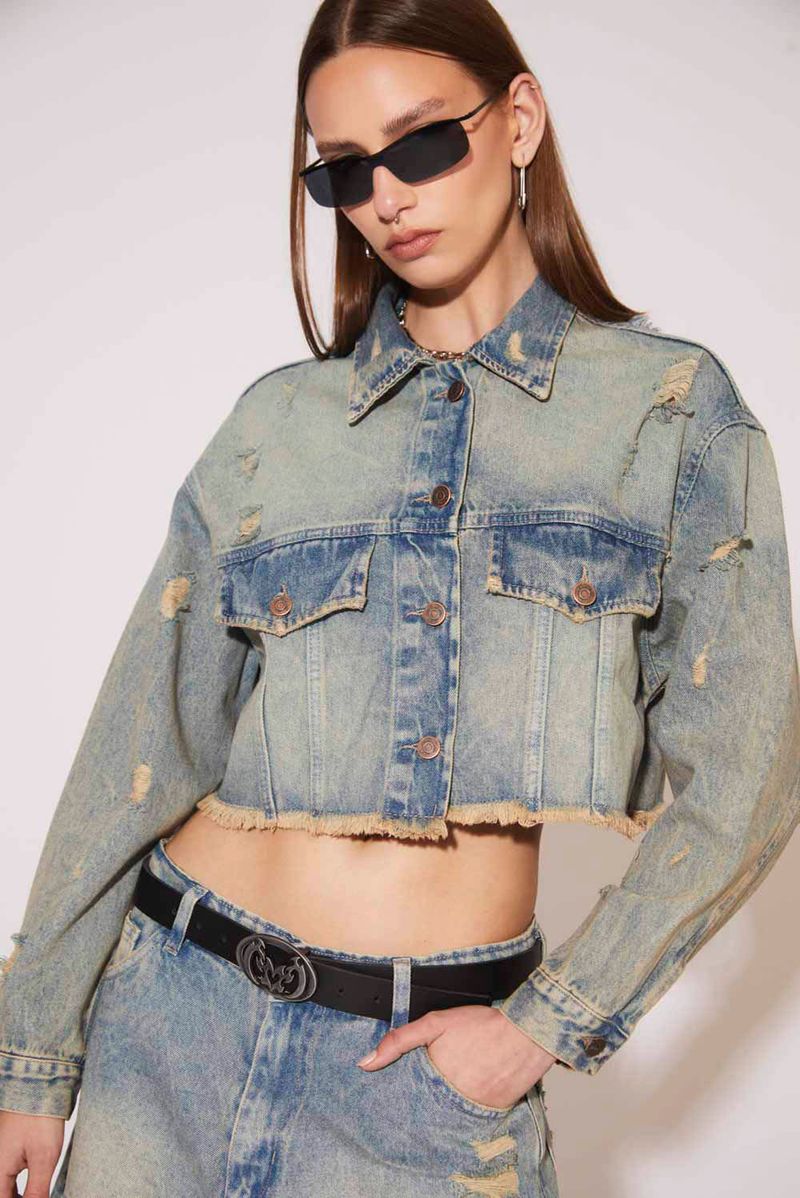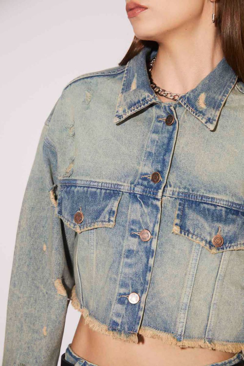 Campera de jean, corte over, largo crop, en denim rígido 100% algodón, color celeste claro. Abertura central con botones metálicos personalizados.