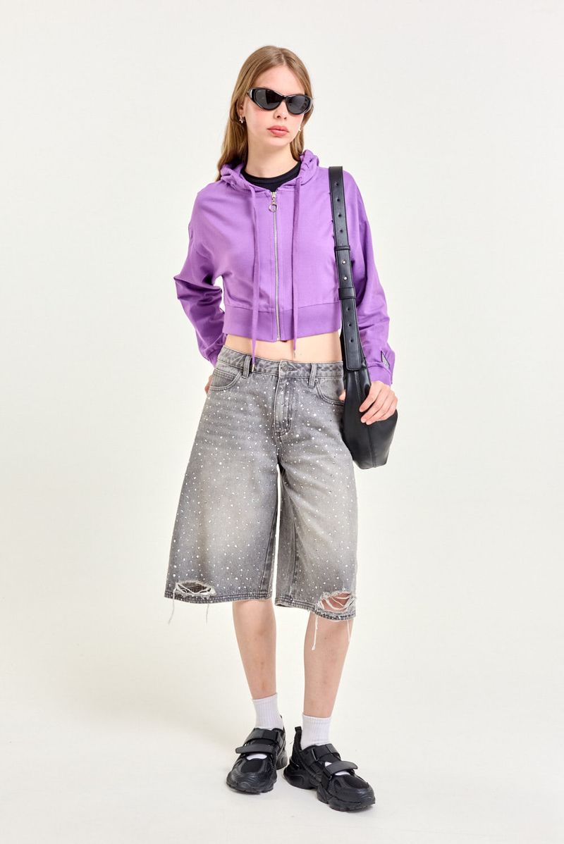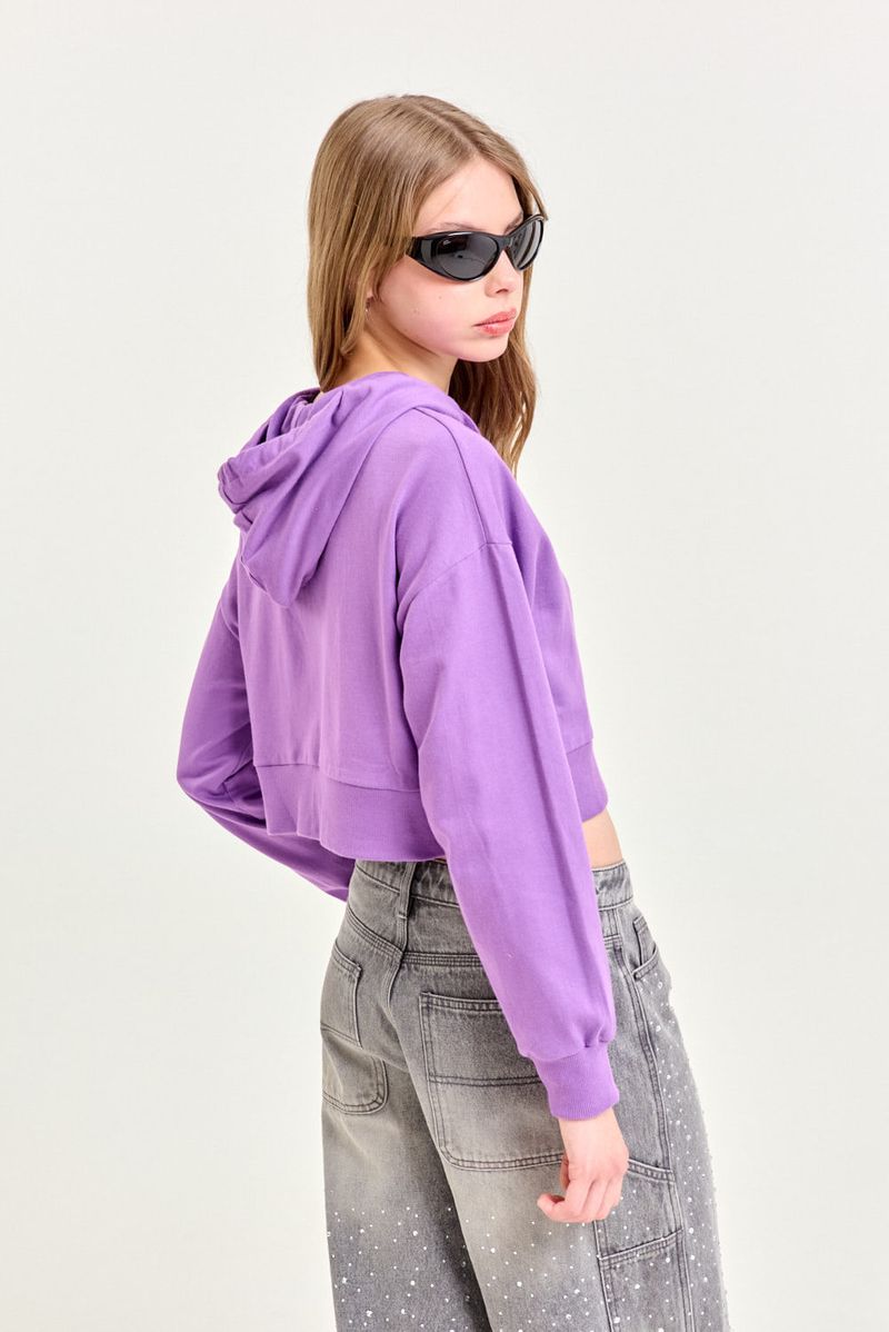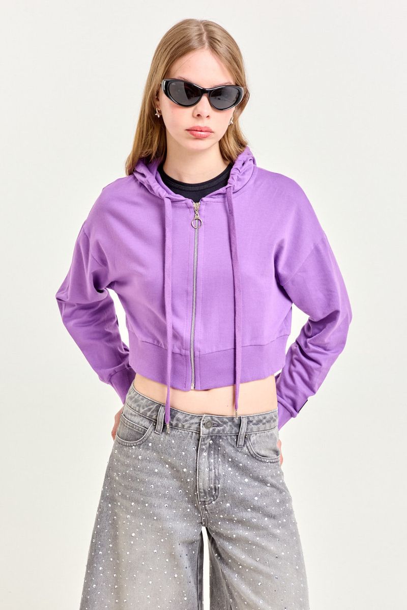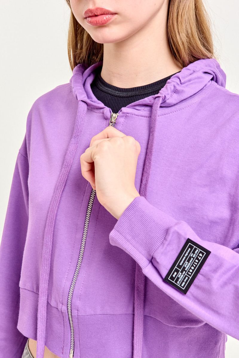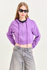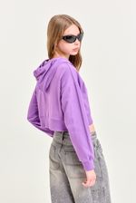 Campera crop de rustico liviano. Capucha forrada en jersey al tono de la base. Cierre metalico con tiracierre personalizado. Detalle de puño aplicado ancho en cuerpo y puños. Largo por arriba de la cintura. Etiqueta institucional personalizada en manga izquierda.