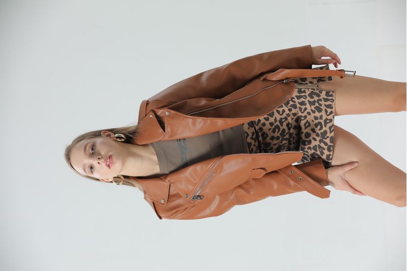 Hecha en eco cuero, esta campera combina estilo y conciencia ambiental. Su cierre cruzado le da un toque clásico y atrevido, mientras que los cierres decorativos agregan un detalle moderno y original. Perfecta para destacar en cualquier ocasión, esta campera es tu mejor opción para un look audaz y con personalidad.