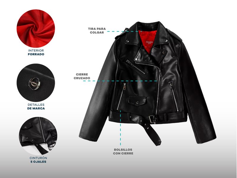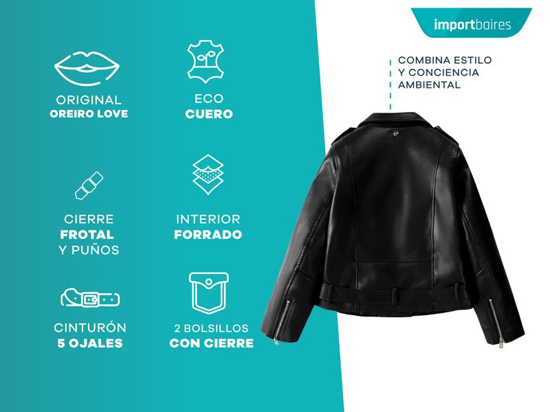 CAMPERA MUJER OREIRO LOVE BIKER CON CINTURON CIERRES ECO CUERO