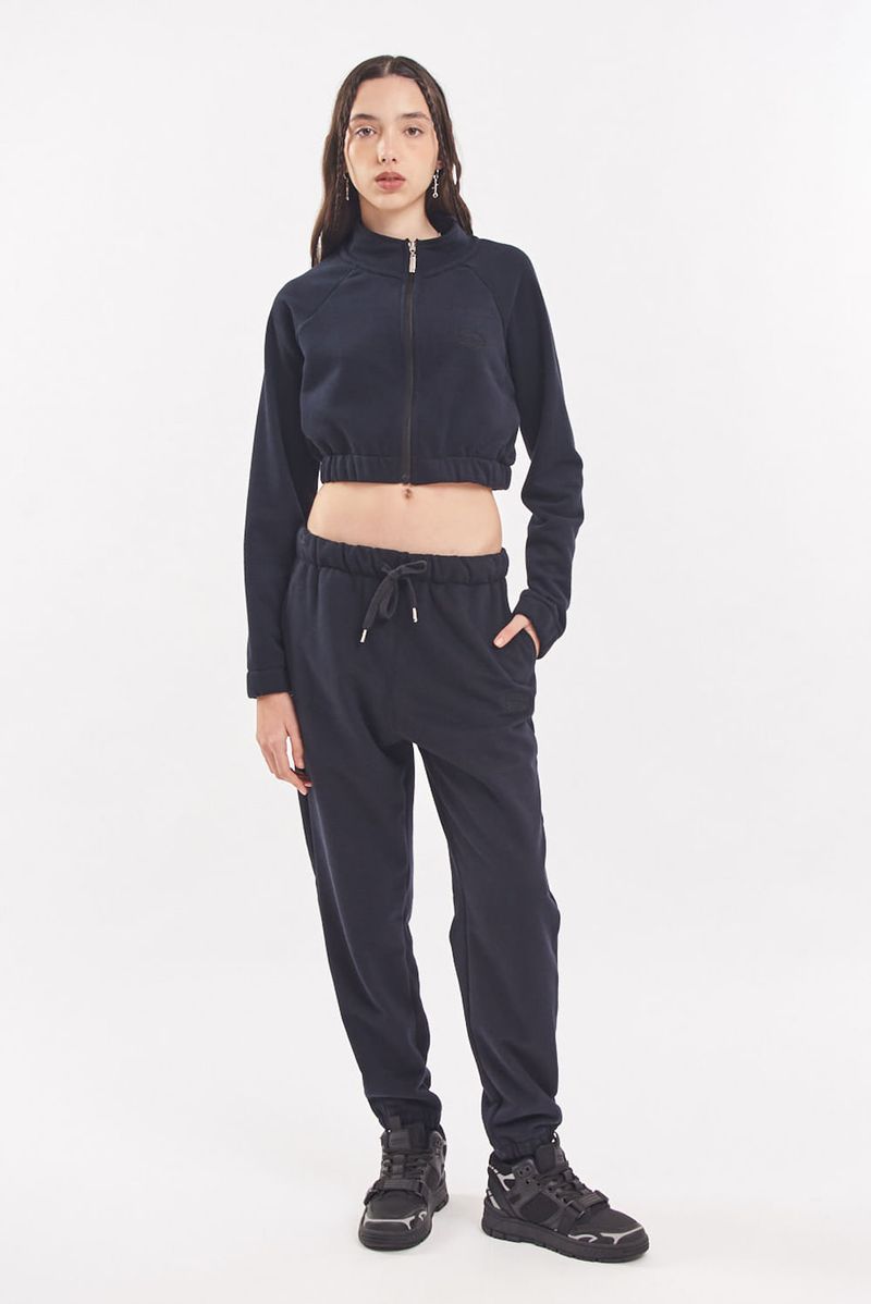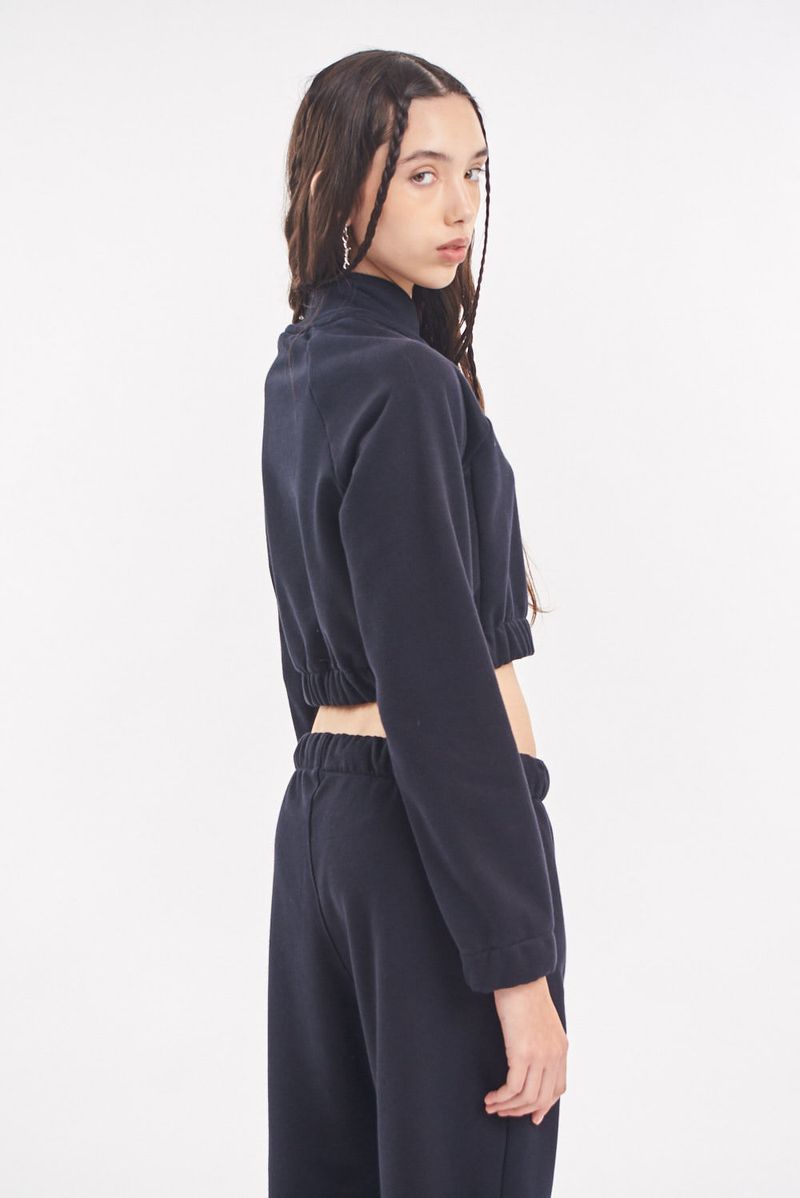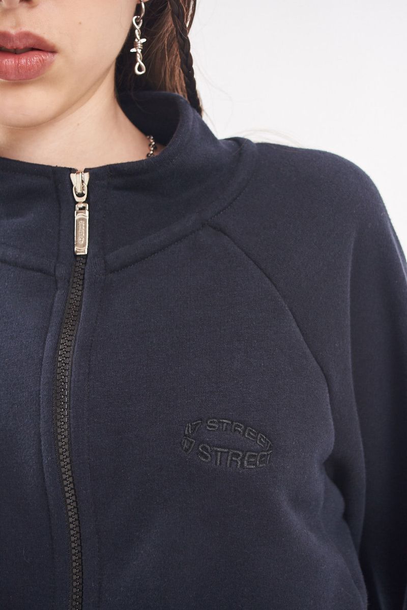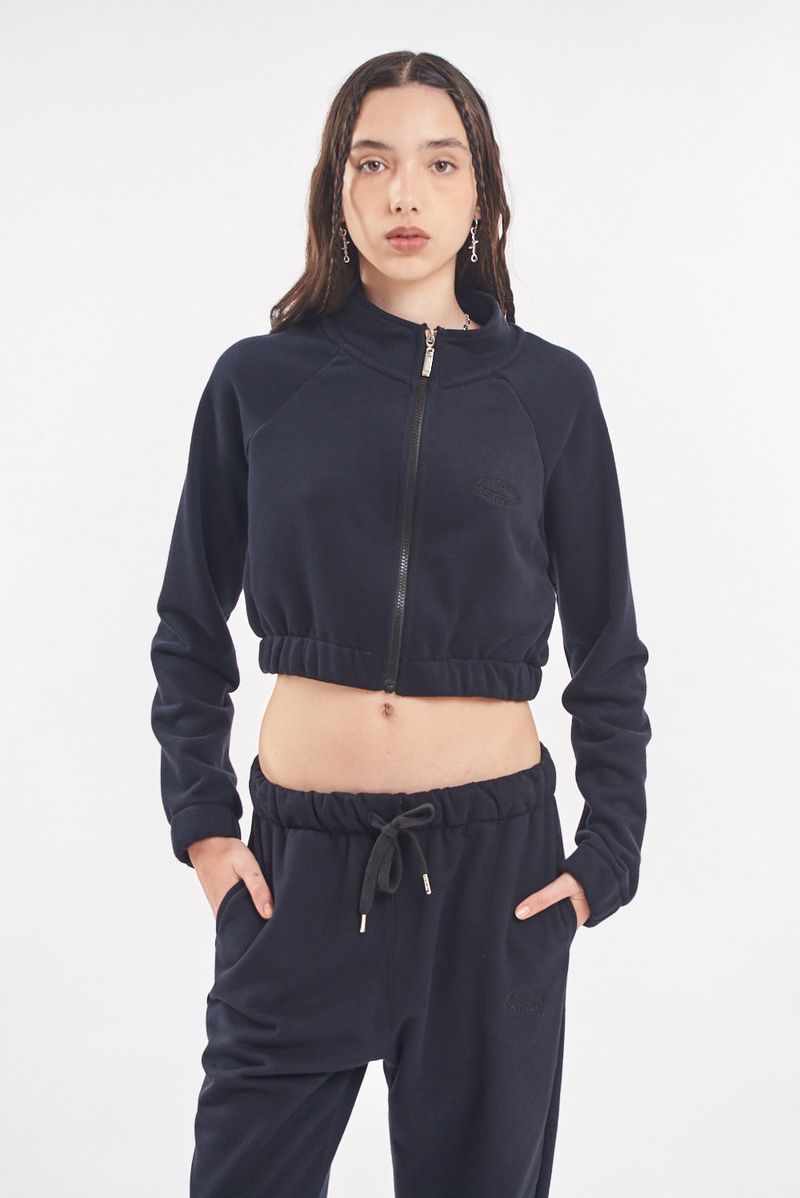Campera de rústico esmerilado. Cuello alto. Cierre al tono de la base con tiracierre personalizado. Manga rangan. Puños y cintura elastizadas. Bolsillos laterales. Estampa en delantero ubicación logo.