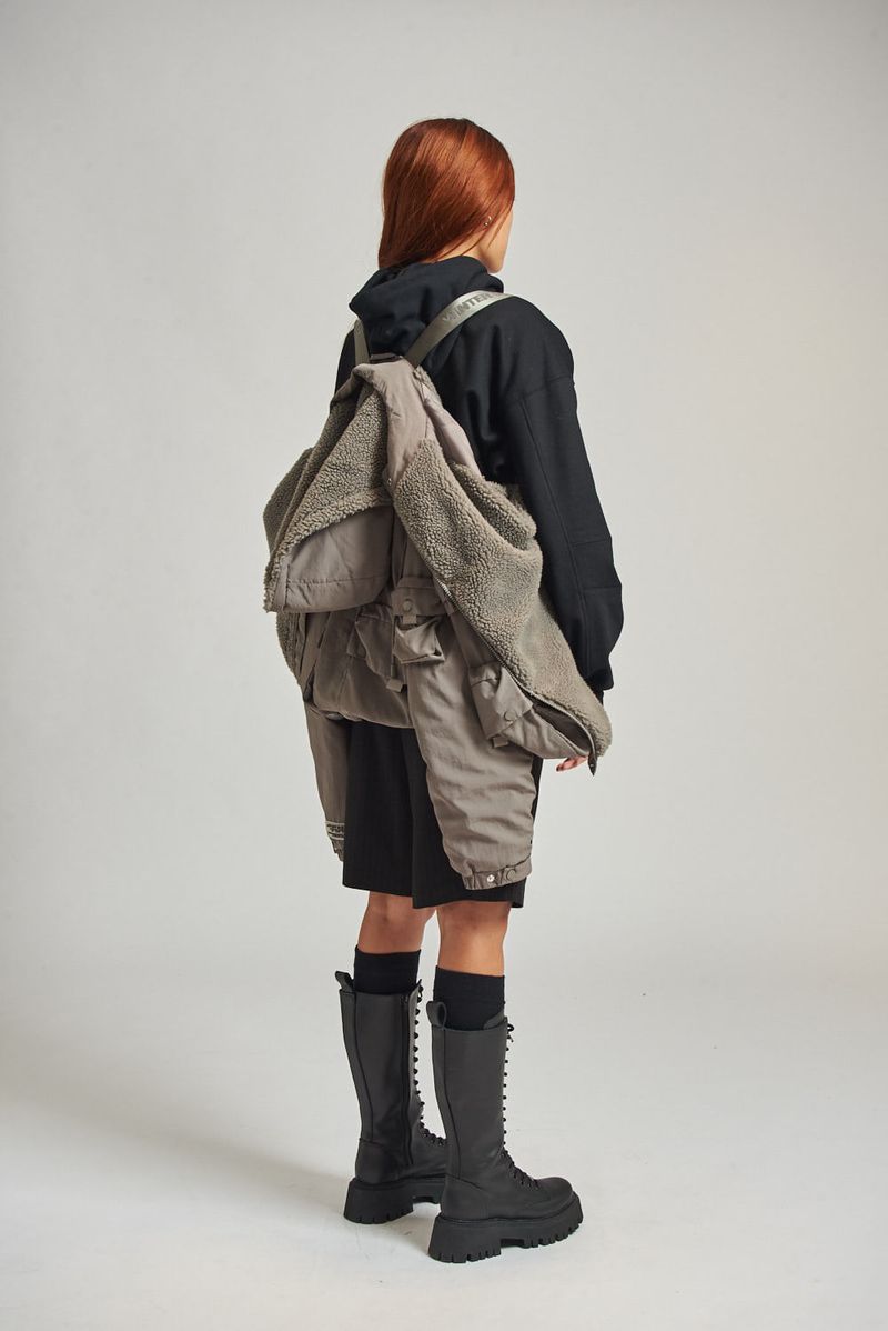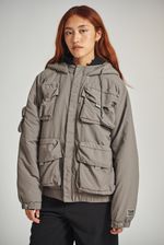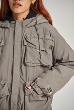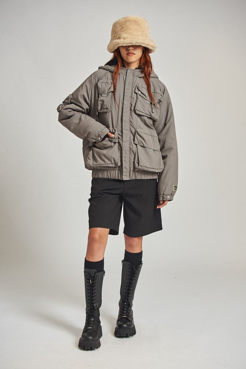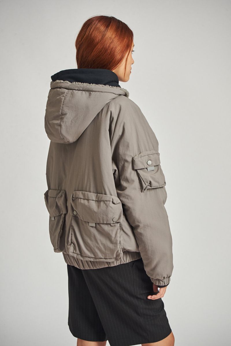 Campera de nylon con corderito interno. Múltiples bolsillos con fuelle y tapa en delantero y en espalda. Capucha en tela base forrada en corderito al tono. Elástico interno en bajo y puños avíos marcarios "47street".