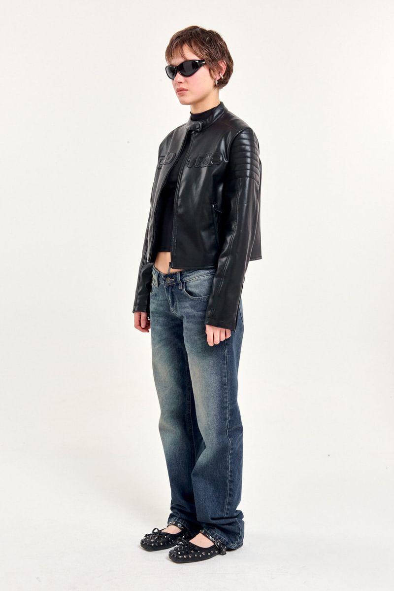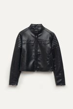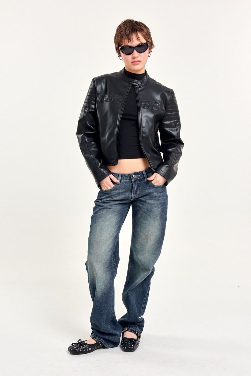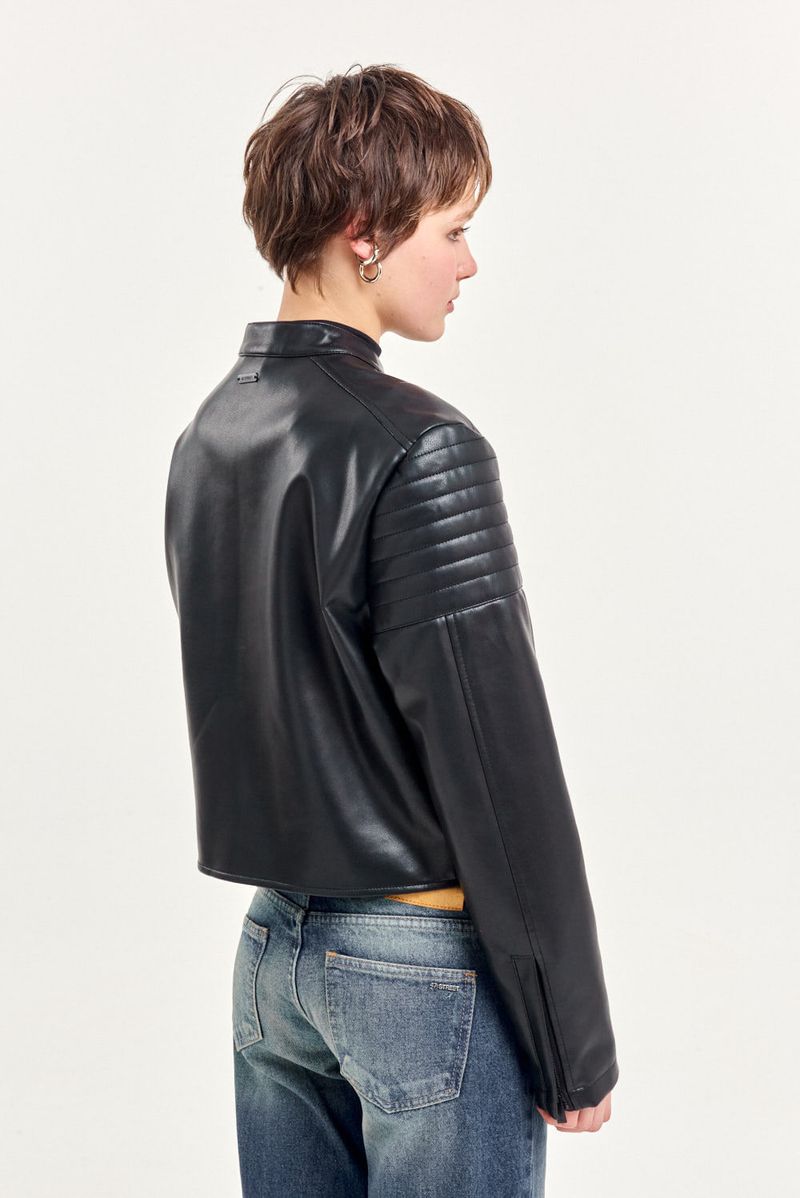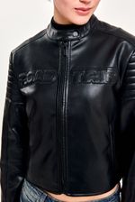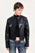 Campera efecto piel tipo motokera con recortes. Lleva múltiples bolsillos, cierres metálicos y cuello redondo con broche snap oculto. Las mangas presentan canelones rellenos y un parche con relieve en el frente que suma personalidad al diseño. Incluye detalles distintivos de la marca. Ideal para usar con jeans rectos y botas para un look fuerte y con actitud.