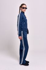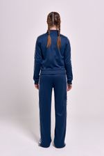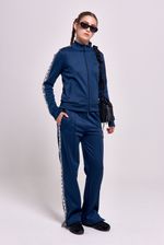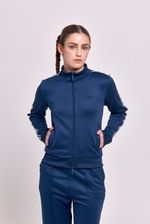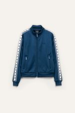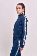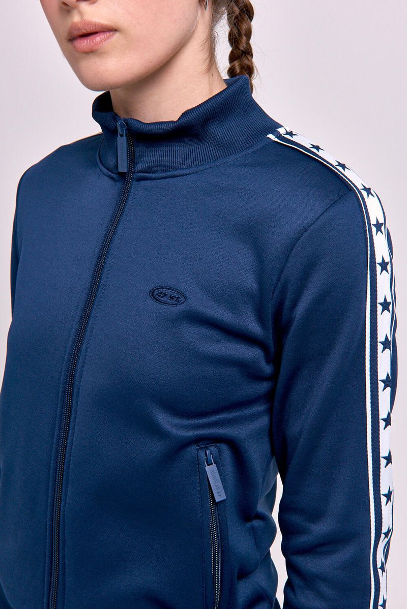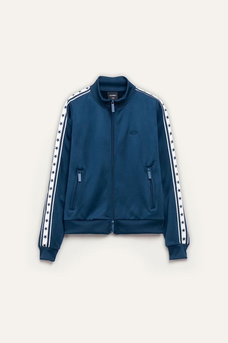 Campera deportiva frizada con cuello alto y cierre al tono con tiracierre personalizado. Cuenta con bolsillos laterales con cierre y detalle en mangas de cintas tejidas con arte de estrellas aplicadas. Bordado institucional en el delantero que completa el diseño.