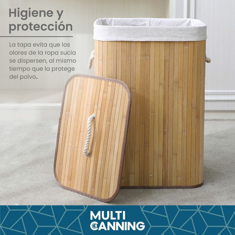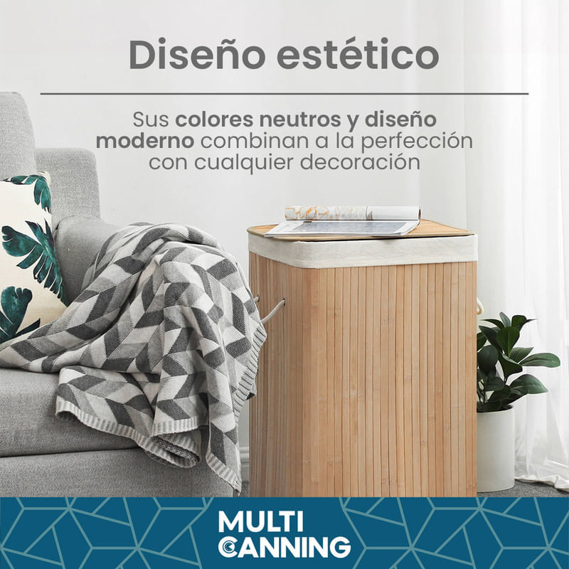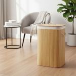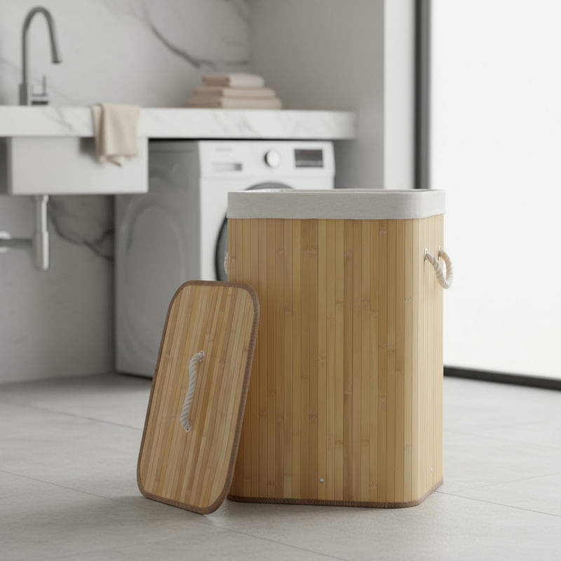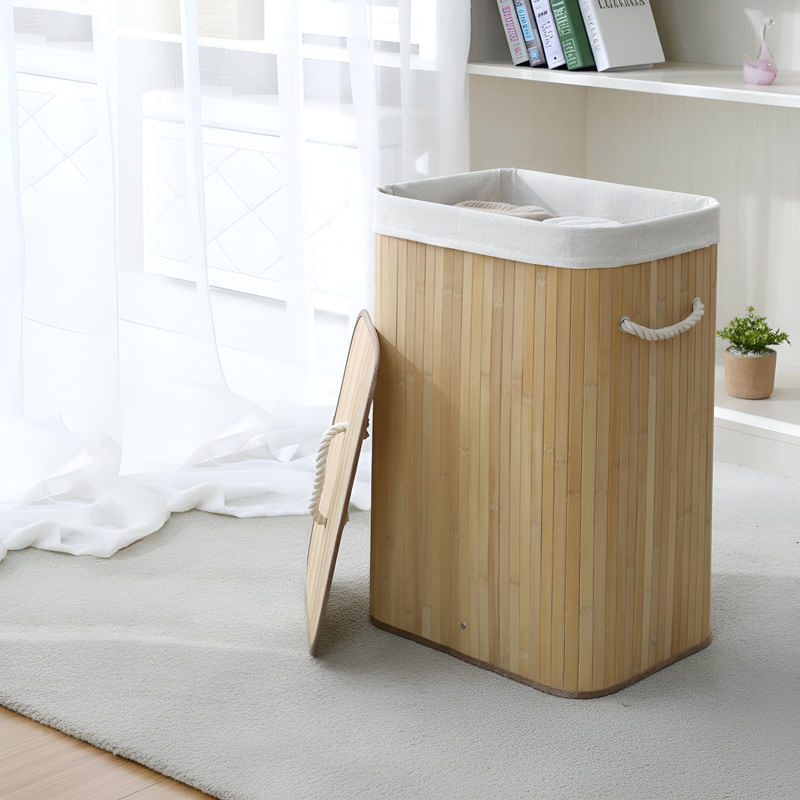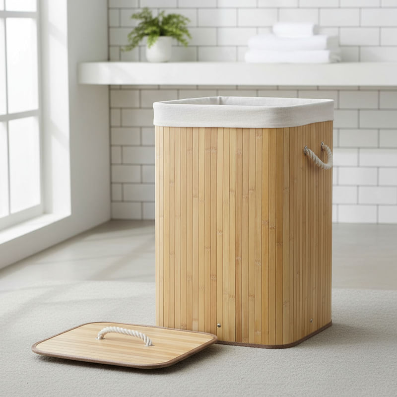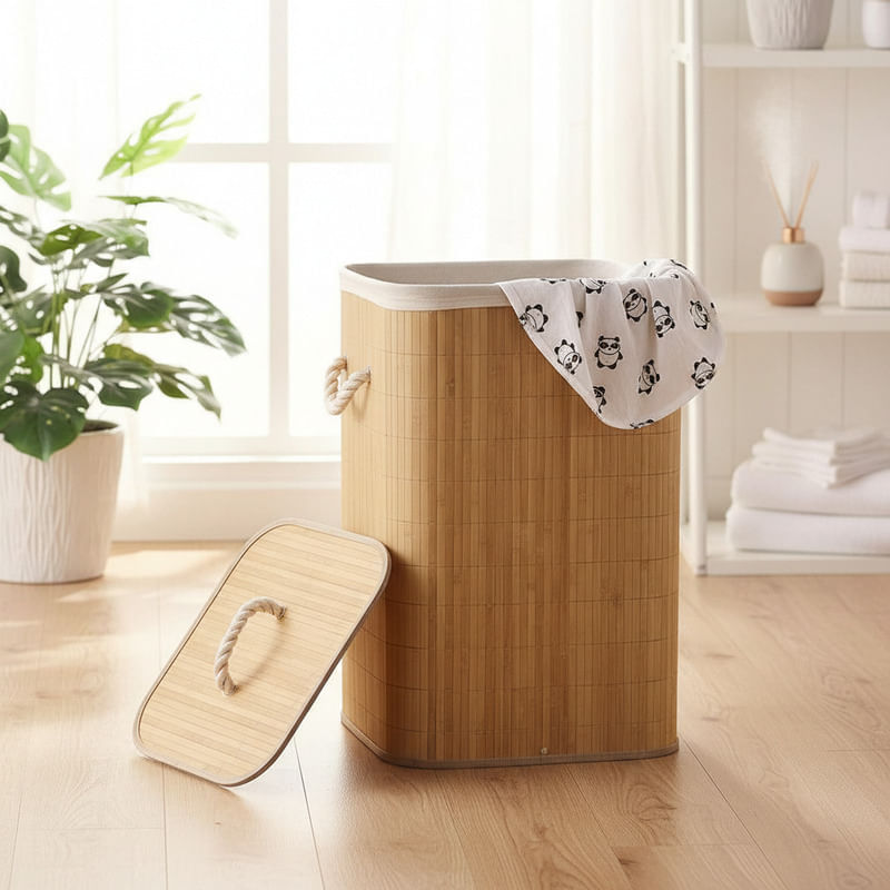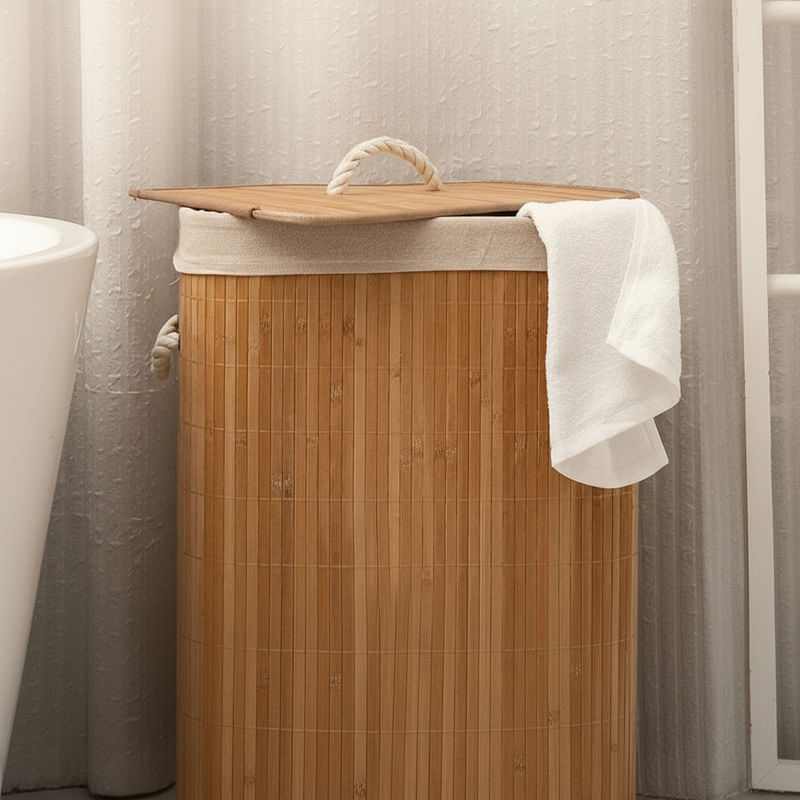 Este cesto de ropa hecho de bambú es perfecto para organizar la ropa sucia de manera práctica y con estilo. Su diseño moderno y natural lo hace ideal para cualquier rincón del hogar, como el baño, dormitorio, lavadero o balcón.