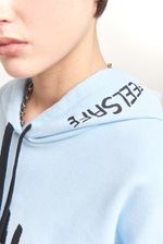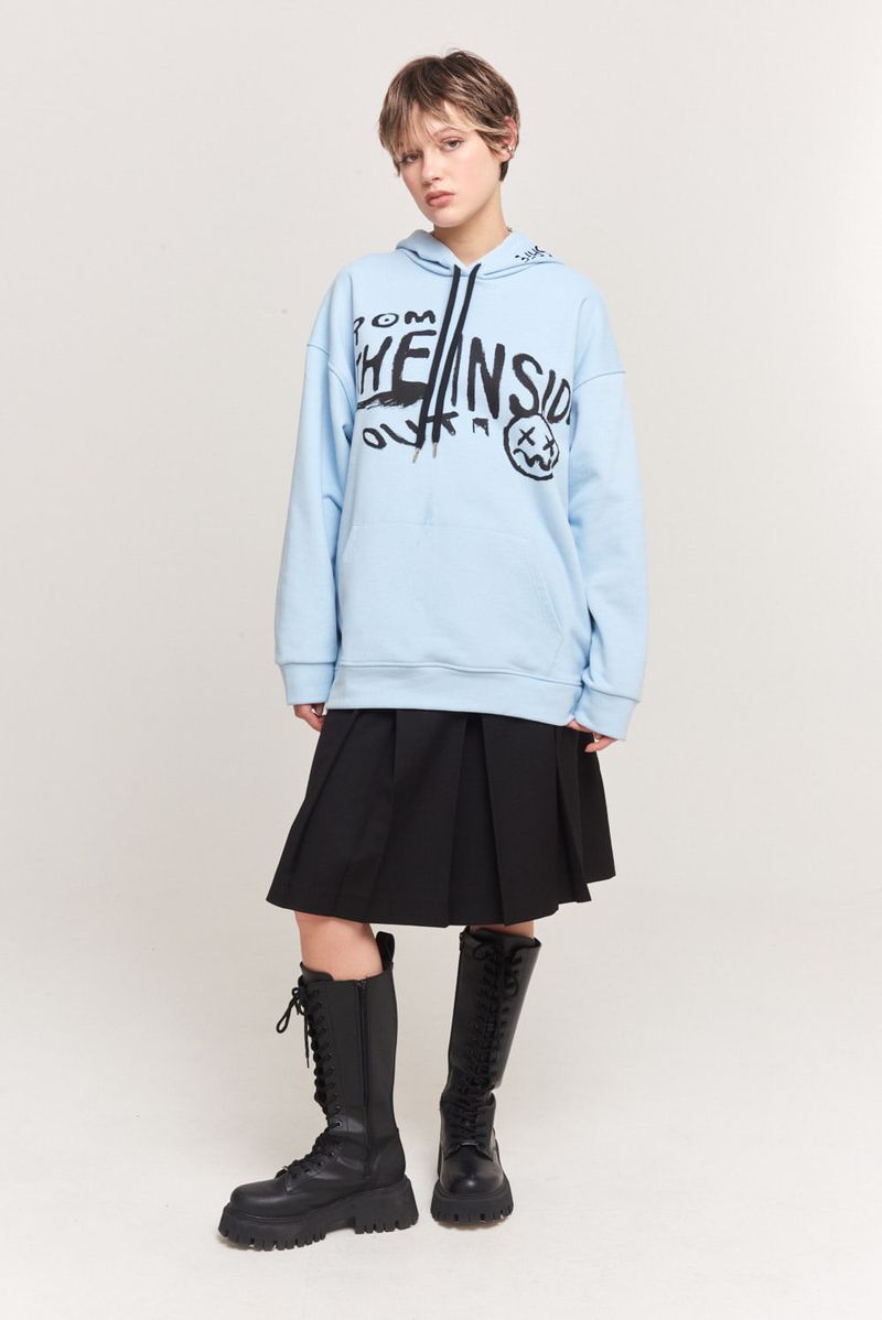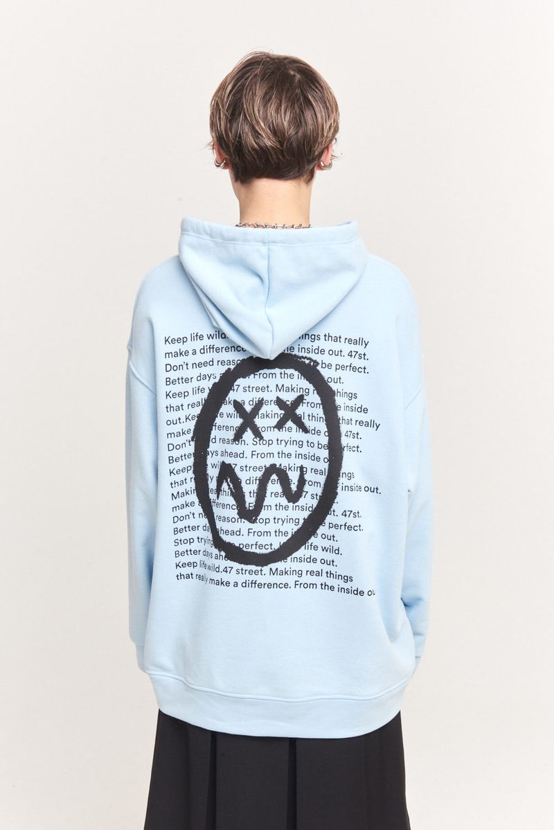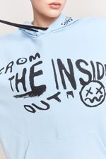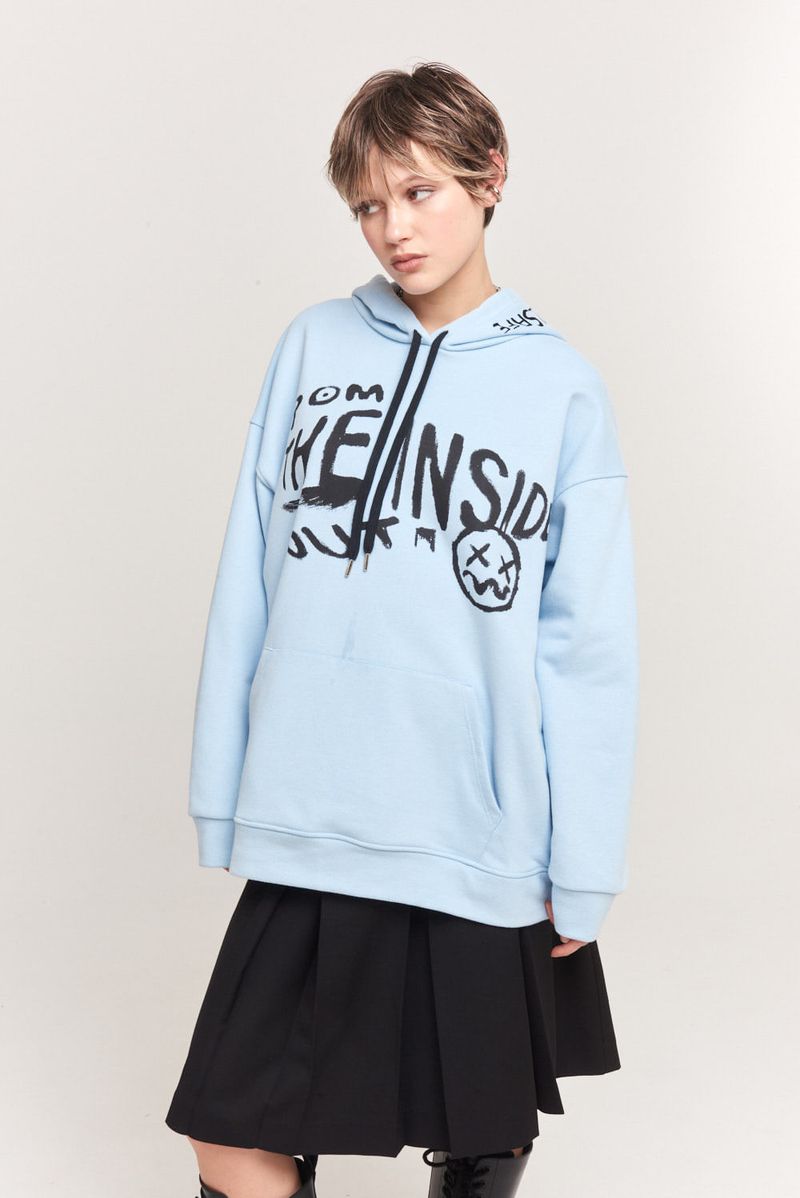 Canguro de rustico esmerilado con capucha y estampa en delantero, espalda y capucha. Corte oversize.