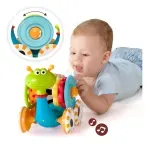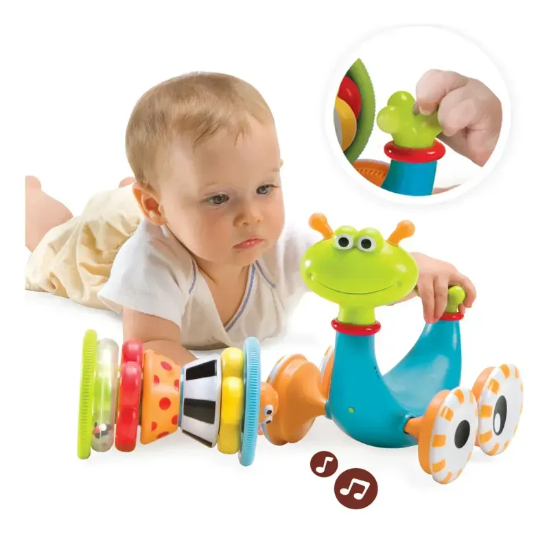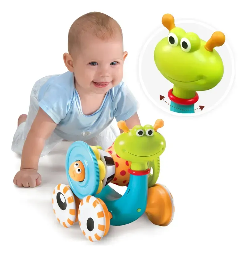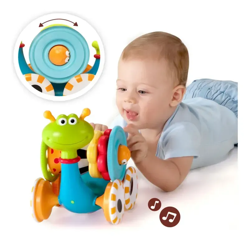 Un caracol musical a pilas que rueda hace girar su caparazón y gira la cabeza de un lado a otro mientras rueda, animando al bebé a gatear.
