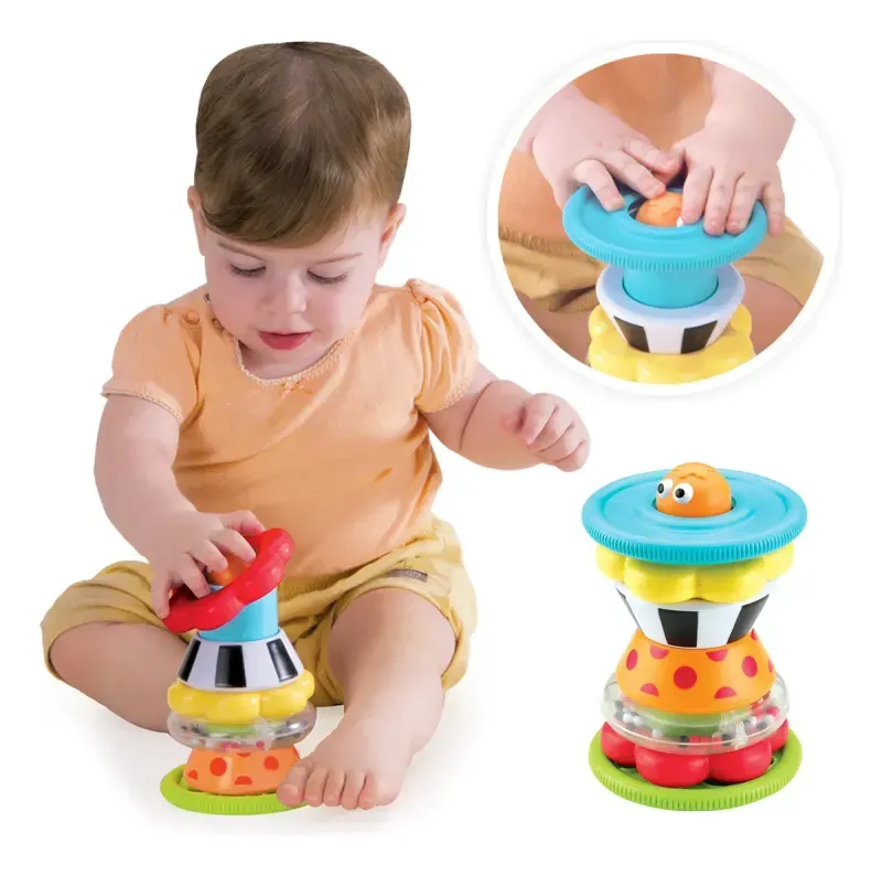 2 juguetes en 1: El caparazón giratorio se desenrosca para convertirse en un juguete apilable de 7 piezas con una carita que se presiona y chirría, y un sonajero.
