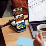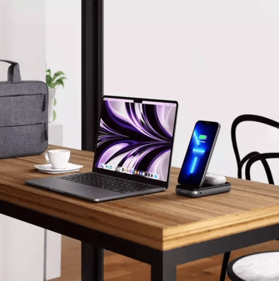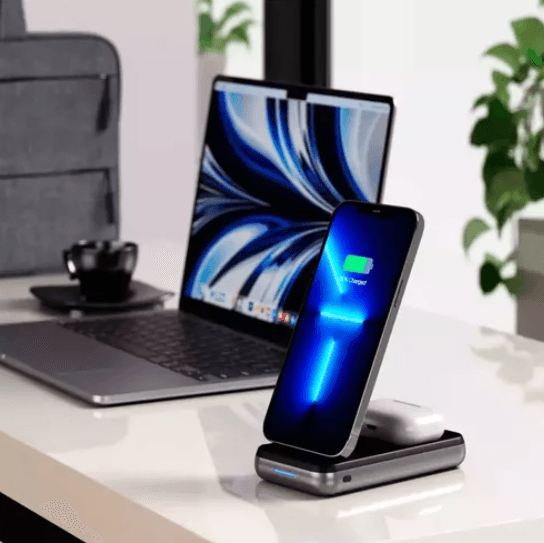 El cargador inalámbrico "Duo" de Satechi es perfecto para transmitir videos, escuchar música o hacer llamadas con manos libres mientras cargas la batería mientras viajas. Admite carga rápida simultánea de hasta 10 W en total para tu iPhone y AirPods. Simplemente levántalo hasta la posición de base para mantener tu teléfono inteligente en un ángulo conveniente para verlo fácilmente de un vistazo.