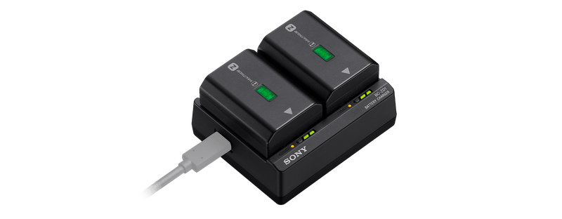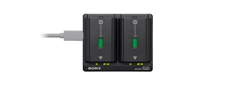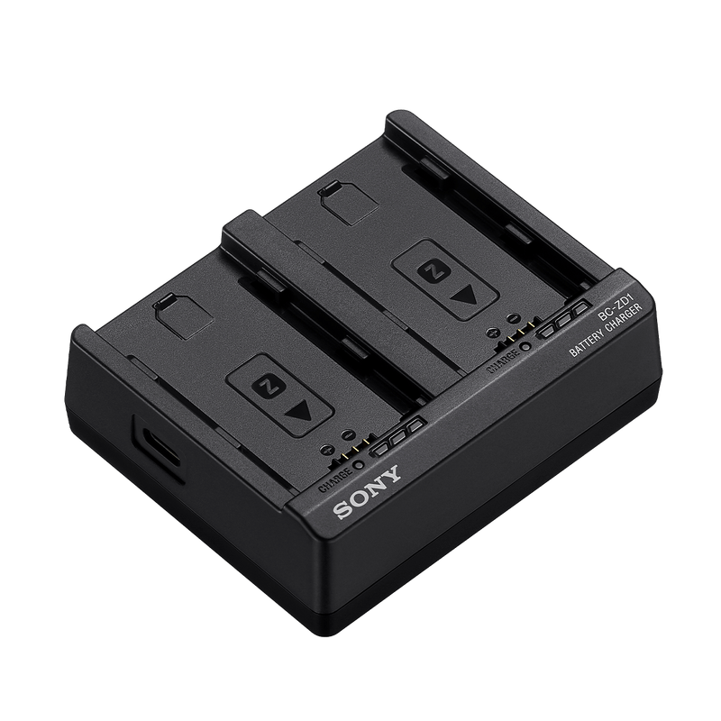 El BC-ZD1 es un cargador con suministro de alimentación USB (PD) para las baterías de alta capacidad NP-FZ100 de Sony1Las baterías NP-FZ100, la fuente de alimentación compatible con USB PD y el cable USB no están incluidos. Compra baterías NP-FZ100, una fuente de alimentación compatible con USB PD con una salida de 30 W o más y un cable USB que soporte una corriente de 3 A o más por separado.2La carga simultánea de dos baterías requiere una fuente de alimentación compatible con USB PD que proporcione 30 W o más. La carga de una sola batería requiere una fuente de alimentación compatible con USB PD que proporcione 18 W o más. Se requiere un cable USB que soporte 3 A o más en ambos casos. El tiempo de carga puede variar según las condiciones de uso.3Las luces de CARGA se apagarán cuando el nivel de carga de batería supere el 90 % (carga operativa). Continua la carga durante otros 30 minutos para alcanzar el límite.