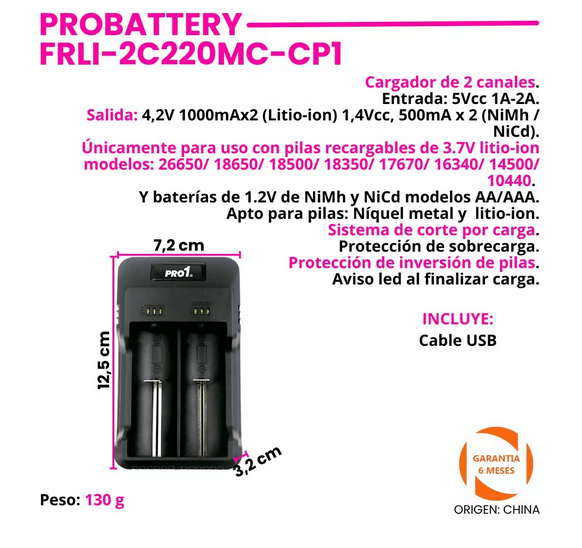 CARGADOR 2 CANALES PILAS RECARGABLES NÍQUEL METAL Y LITIO-ION INDICADOR LED PROBATTERY PRO1 USB UNIVERSAL
