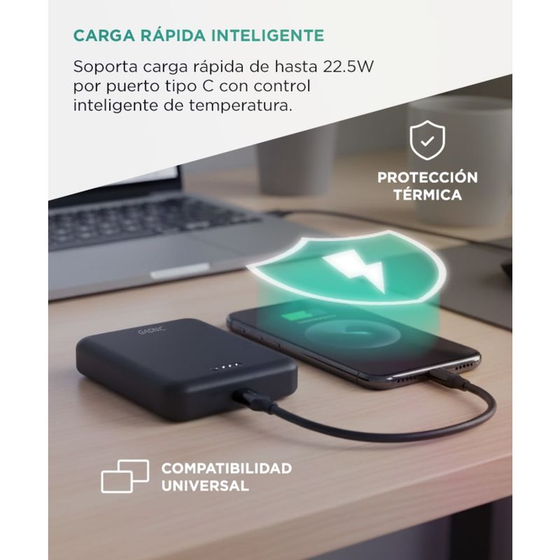 Puerto de entrada y salida rápida 22.5W, compatible con múltiples dispositivos y accesorios.