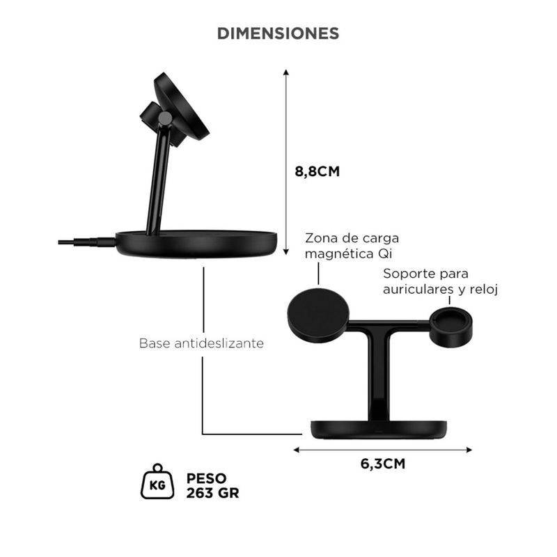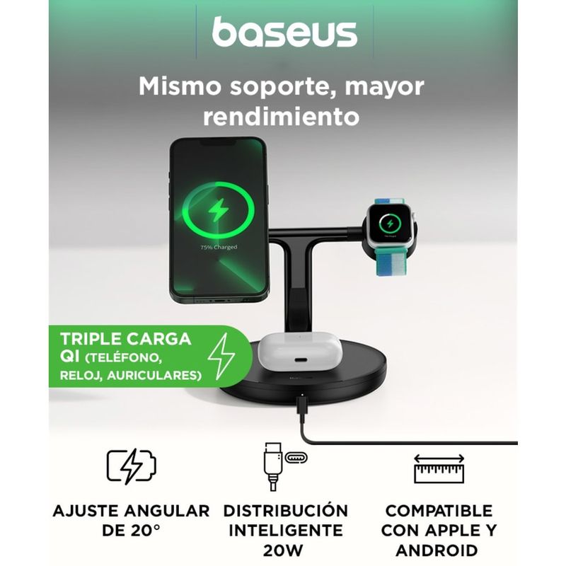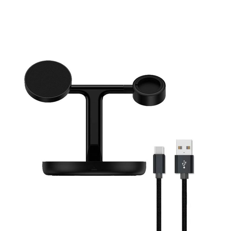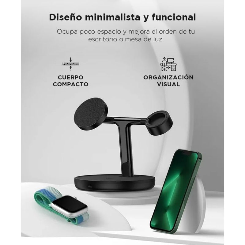 Teléfono, reloj inteligente y auriculares en un solo soporte. Organizá tu espacio de carga.