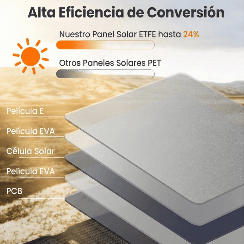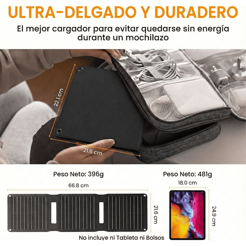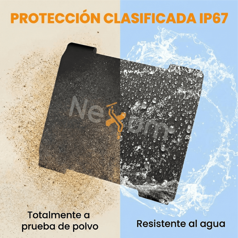 Su diseño plegable cabe en cualquier mochila y su certificación IP67 asegura resistencia total a polvo y agua. Es el complemento ideal para nuestra línea de energía solar portátil.