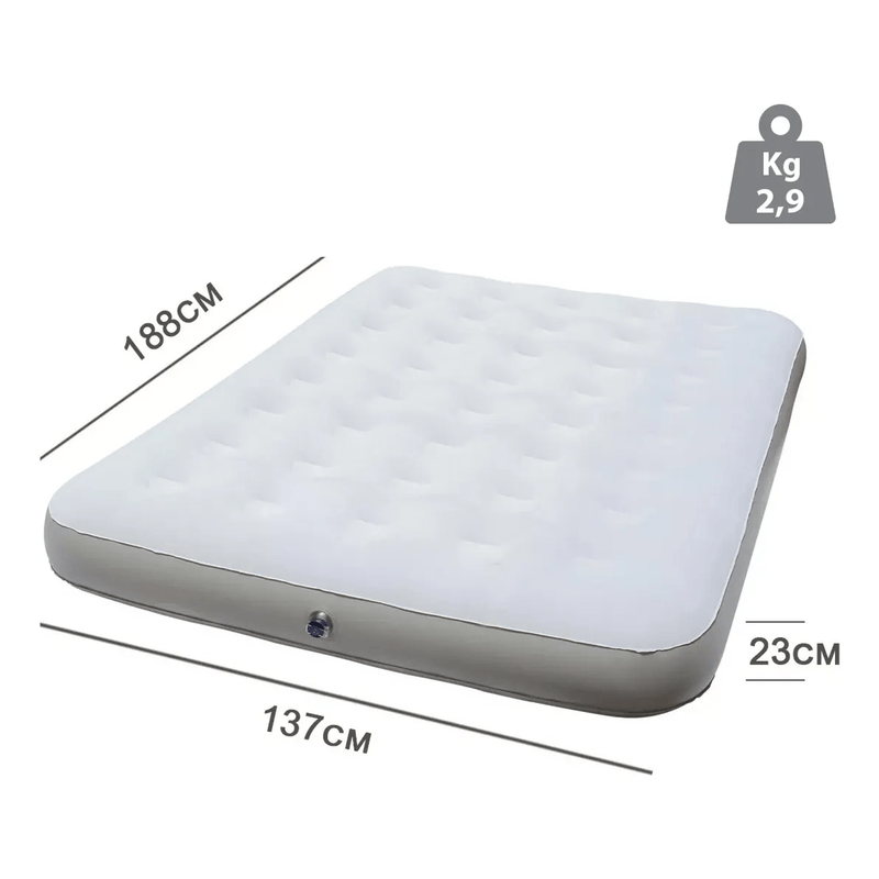 - 1 colchón inflable de 2 plazas (188 x 137 x 23, 2,9 kg), con cubierta de terciopelo antideslizante, válvula regulable y costuras termoselladas.
