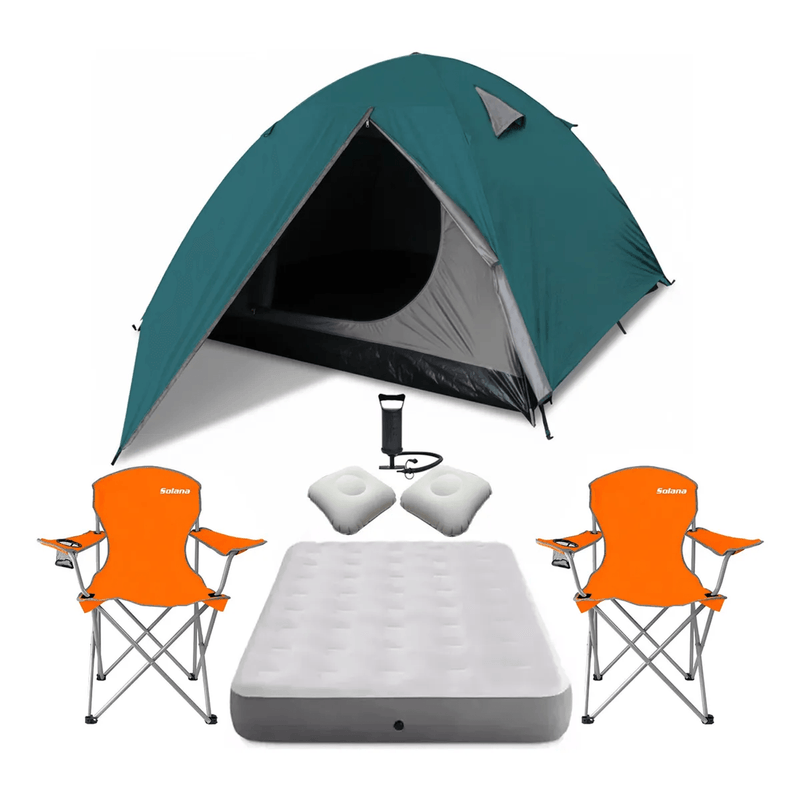 Combo Solana – Carpa 4 Personas + Colchon Inflable 2 Plazas + Almohadas + Inflador + 2 Sillones Plegables