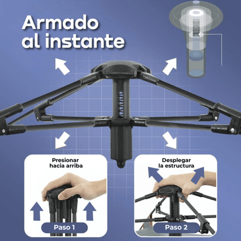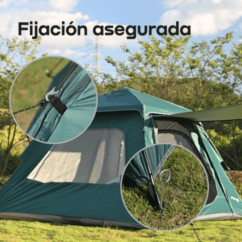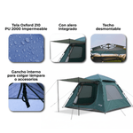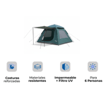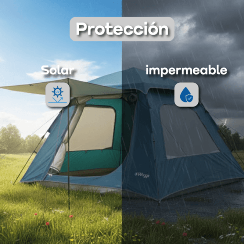 La WAGGS CARP07 está pensada para quienes buscan una carpa autoarmable amplia, práctica y resistente para disfrutar escapadas en familia o con amigos, combinando armado rápido, protección real y mayor comodidad. Su sistema HUB garantiza una estructura firme y estable en pocos segundos, mientras que el alero frontal integrado suma un espacio extra ideal para cocinar, organizar equipos o relajarse a la sombra. Fabricada en tela Oxford 210 con recubrimiento PU 2000 y filtro UV, ofrece protección confiable frente a lluvia y sol, adaptándose a sierras, lagos, bosque o playa. Cuenta con dos accesos completos con mosquitero Mesh B3, ventanas laterales con cierre interno y ventilación cruzada en todos los ingresos, asegurando circulación constante de aire y un interior fresco incluso en días de calor. Con capacidad para 4 a 6 personas, la CARP07 equilibra espacio, resistencia y funcionalidad, convirtiéndose en una aliada confiable para quienes priorizan practicidad, armado rápido y protección en cada aventura junto a WAGGS.