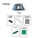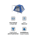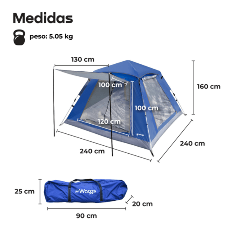 La Carpa Autoarmable WAGGS CARP09 está pensada para quienes buscan mayor espacio sin perder practicidad ni rapidez de armado. Su sistema autoarmable con varillas flexibles permite montarla en minutos, mientras que el techo desmontable se adapta al clima ofreciendo ventilación total o protección reforzada cuando es necesario. Con dimensiones amplias y capacidad para hasta 6 personas, brinda un interior cómodo y bien aprovechado, ideal para familias o grupos. Los aleros reforzados en ambas puertas aportan sombra, resguardo y mejor circulación de aire, y los mosquiteros Mesh B3 en accesos y ventanas mantienen el interior fresco y libre de insectos. Fabricada con tela Oxford 210, impermeabilidad PU3000 y costuras reforzadas, la CARP09 combina espacio, resistencia y diseño moderno para disfrutar escapadas más cómodas, ventiladas y simples desde el primer minuto junto a WAGGS.