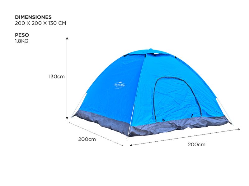 Con amplias dimensiones de 200 x 200 x 130 cm, esta carpa ofrece un espacio cómodo y generoso para hasta 4 personas, ideal para escapadas en familia o con amigos. ¡Explora la naturaleza con la comodidad y resistencia de South Port!