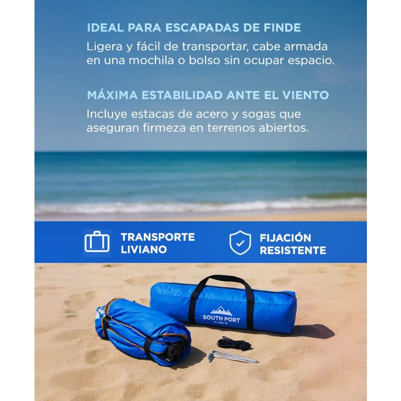 Tela impermeable y estacas de acero incluidas para asegurar firmeza incluso en condiciones exigentes.
