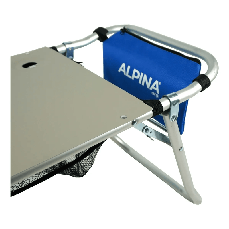 Con su estructura plegable, podés guardarlo y trasladarlo sin ocupar espacio. Incluye una práctica red inferior para guardar elementos personales, bebidas o toallas, y un cómodo almohadón desmontable con el logo Alpina.