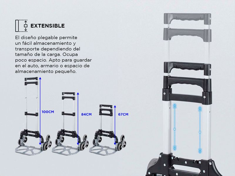 Manija Telescópica Ajustable: La manija telescópica ajustable permite a los usuarios ajustar la altura según su preferencia, lo que proporciona una ergonomía óptima y facilita el manejo de la carretilla.