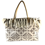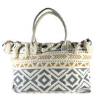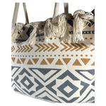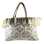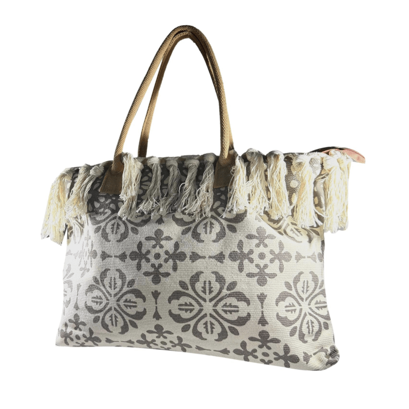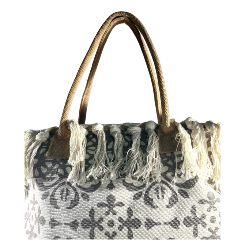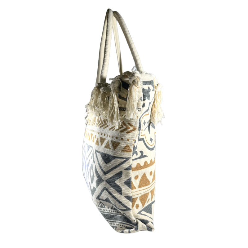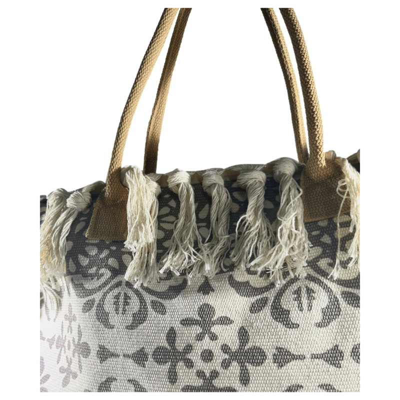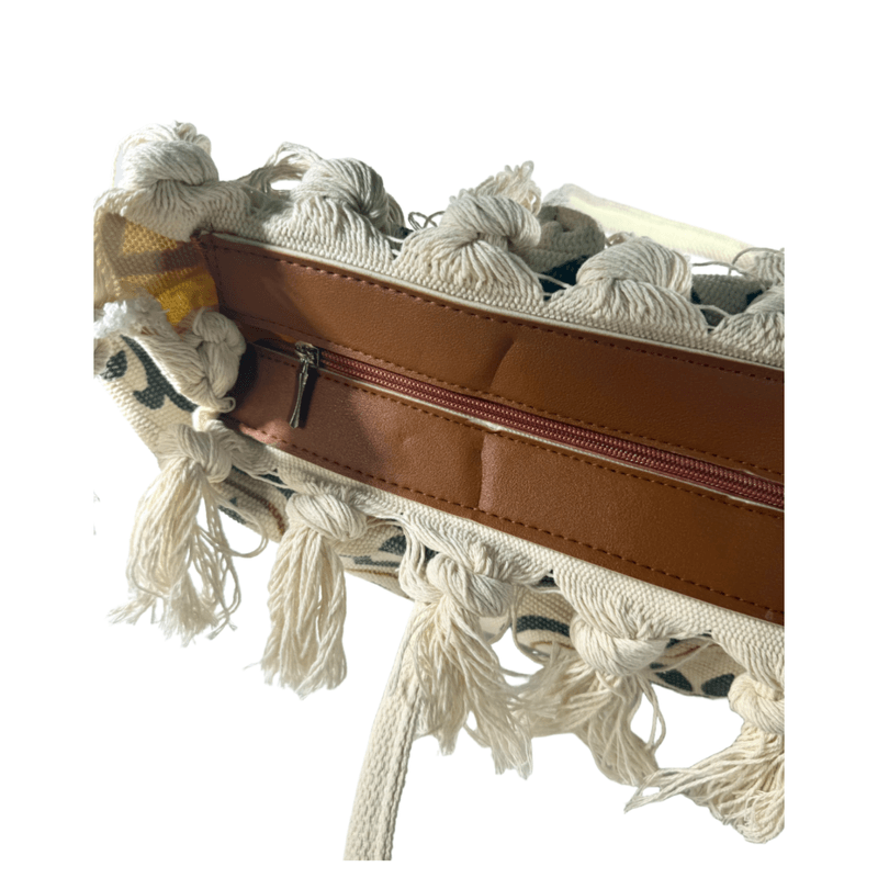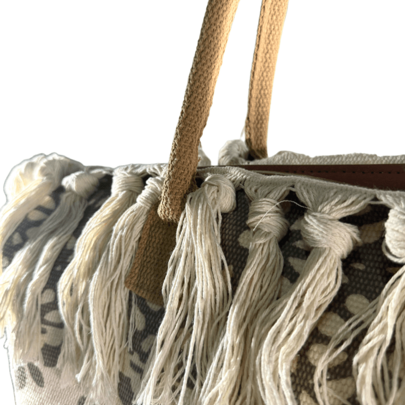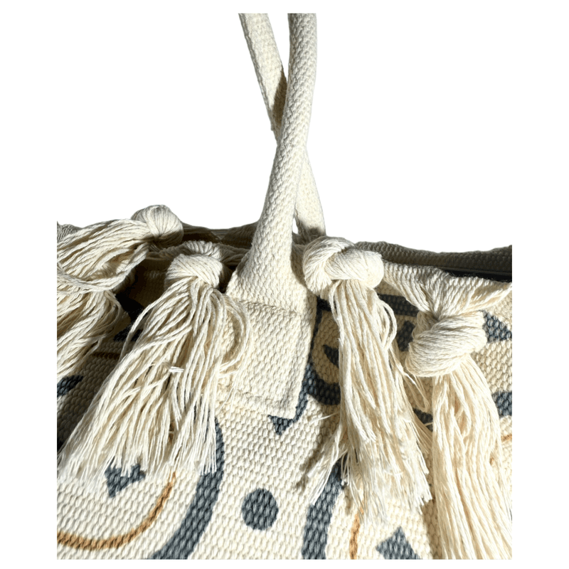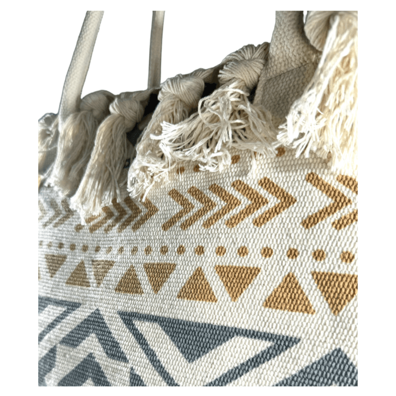 Está confeccionada en tela resistente tipo loneta, con diseños boho/étnicos y borlas tejidas a mano en todo el borde superior, lo que le da ese estilo relajado y chic que amamos.