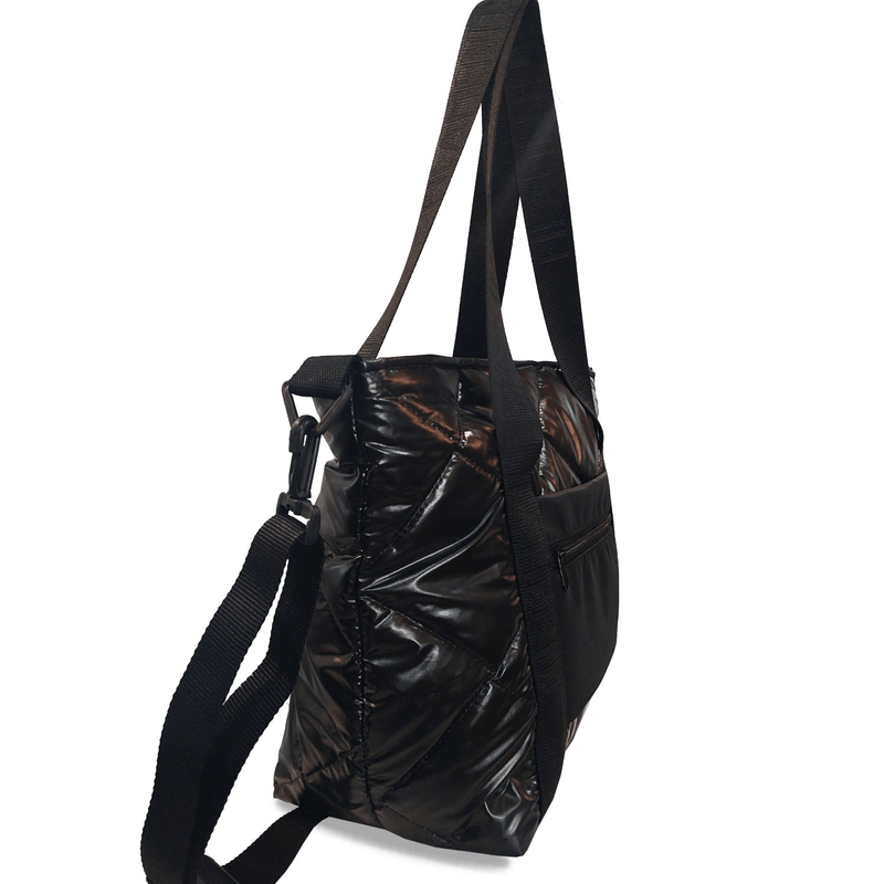 Confeccionada en sire matelaseado. Forrada en sylver. Bolsillo externo con cierre en la espalda para acoplar en la valija de viaje. Bolsillo interno. Correa desmontable y regulable. Manijas con la marca grabada. Cierre relampago en la boca. Base firme para conservar su forma. Medidas: 47 cm ancho x 34 cm de alto x 18 cm de profundidad.