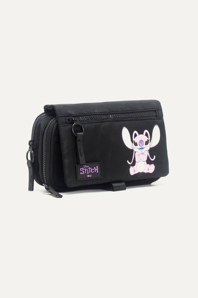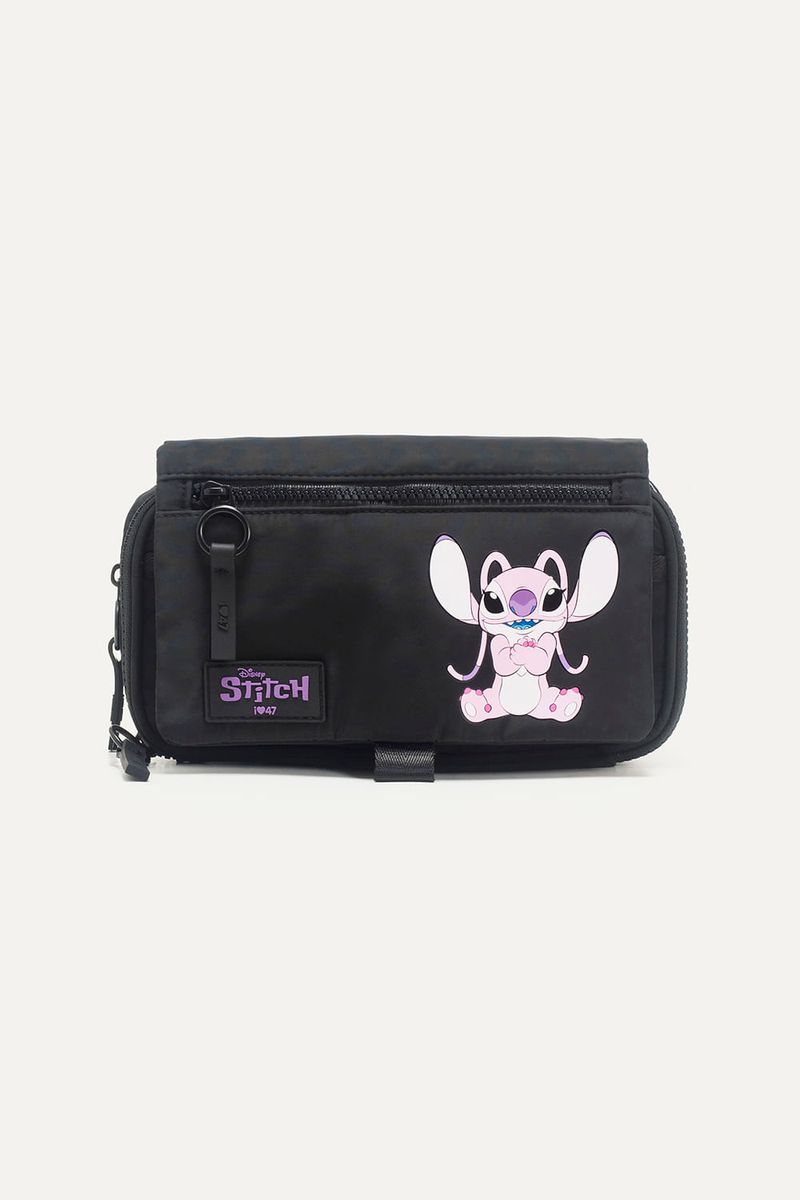 Cartuchera con estampa de "Angel" con un contenedor principal y uno desplegable con bolsillos en cada cara, uno con red traslucido y otro oculto. Tiene una solapa con cierre imantado y un bolsillo para objetos de fácil acceso. Tiene tira cierres 47STREET. Confeccionado en una tela repelente al agua y de fácil limpieza. Producto con licencia oficial Disney.