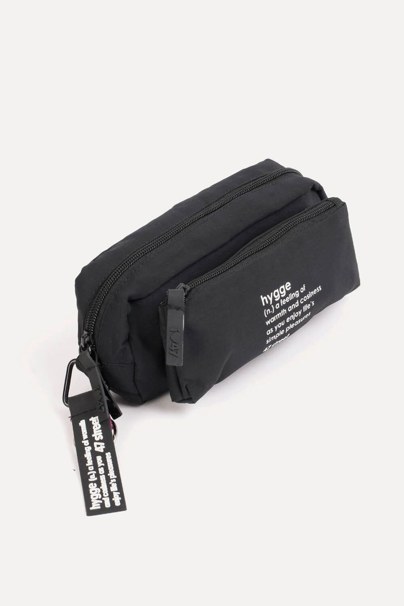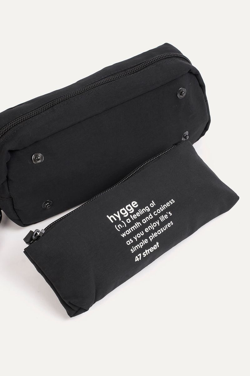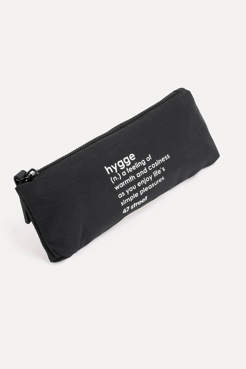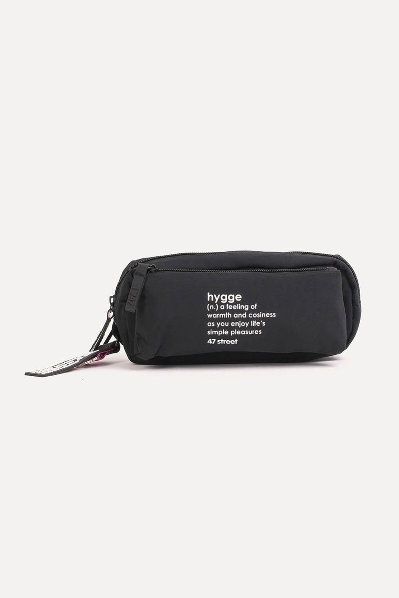 Cartuchera de nylon texturado mate. Posee un bolsillo desmontable a partir de 4 botones metálicos. Estampa "HYGGE" en frente. Mosquetón con llavero de silicona "HYGGE". Posee tiracierres marcarios de silicona.