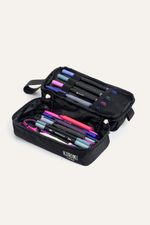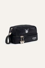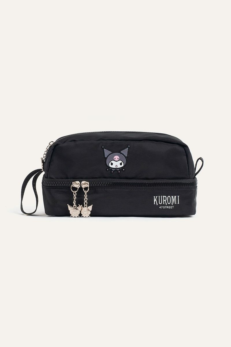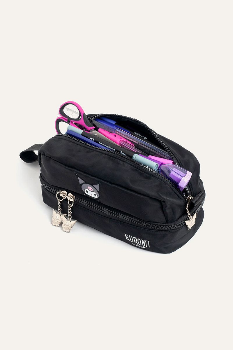 Cartuchera con estampa de Kuromi, diseñada para organizar útiles escolares de manera cómoda. Tiene dos compartimentos, uno principal y otro inferior con divisiones internas, y tiracierres con diseño de Kuromi que suman un detalle canchero. Confeccionada en nylon, material repelente al agua y de fácil limpieza, ideal para el uso diario en el cole. Producto con licencia oficial de Sanrio.