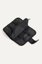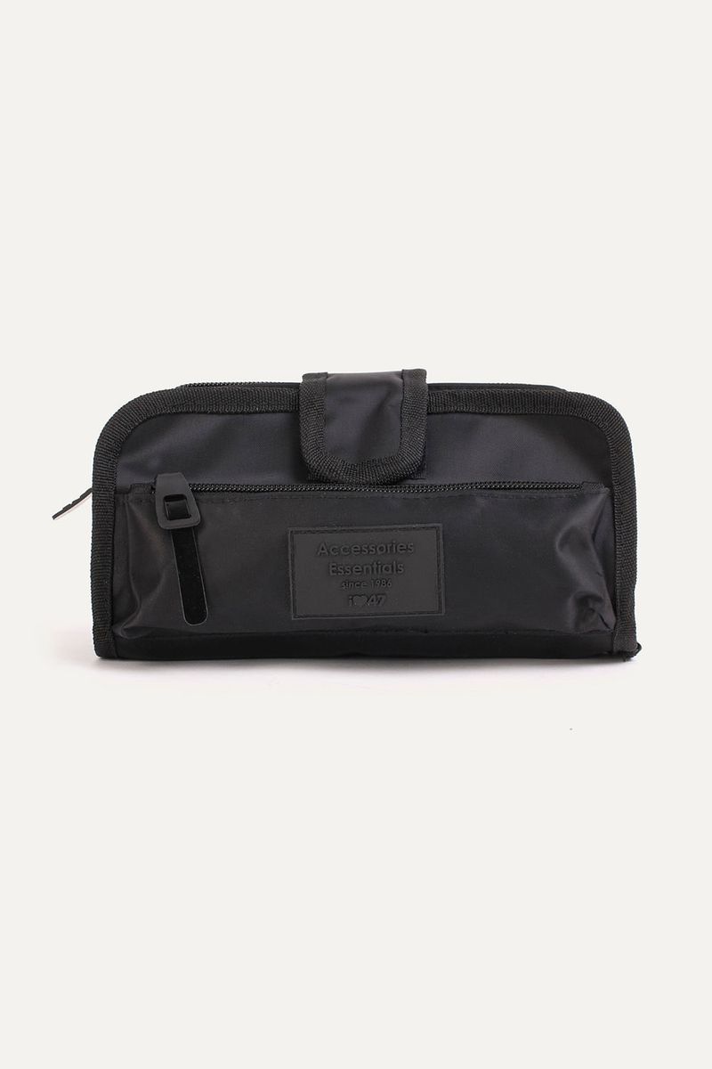 Cartuchera de nylon con múltiples compartimientos y bolsillos. Cierres de nylon. Tira con belcro para cerrar. Tiracierres de silicona. Goma de silicona marcaria "Accesories essentials" en parte delantera.