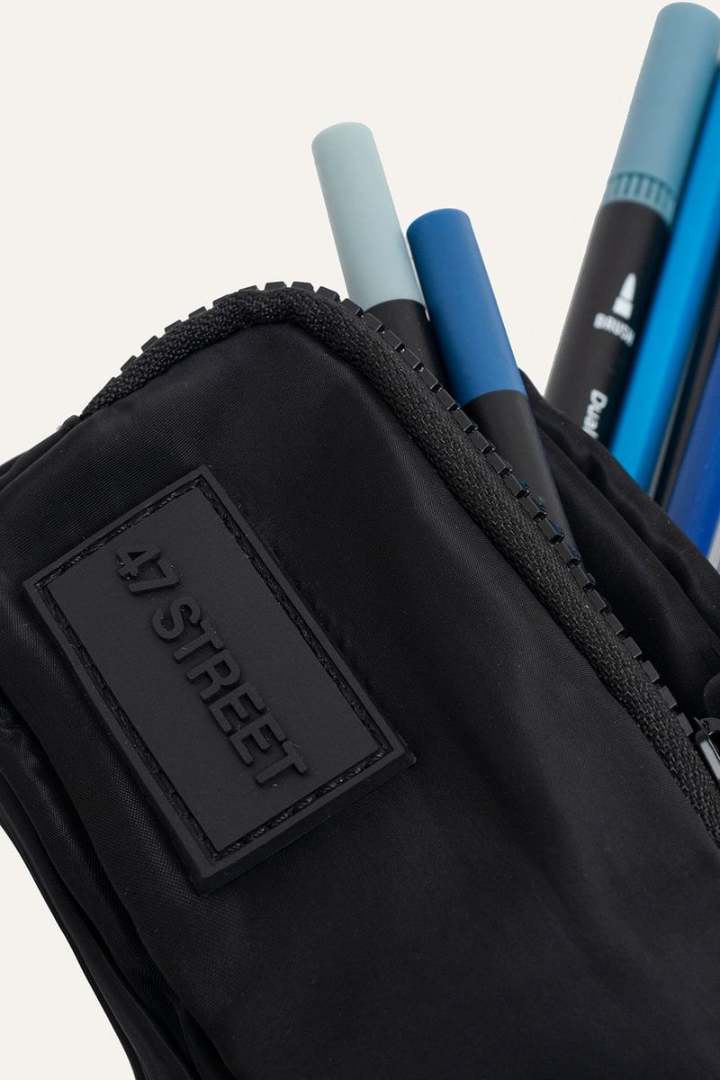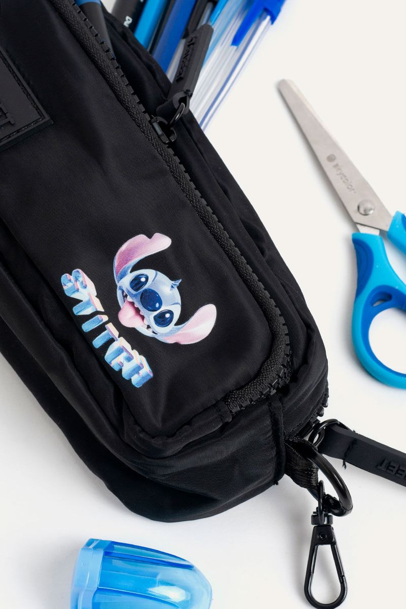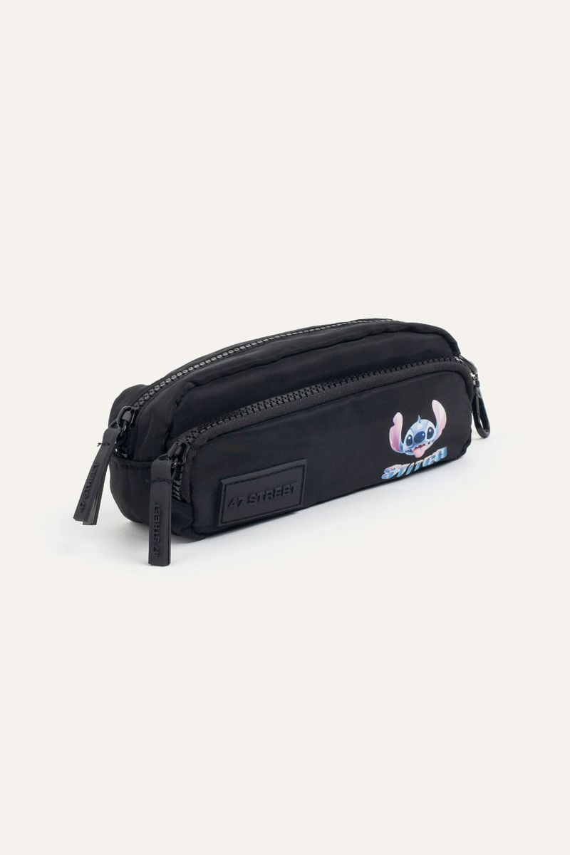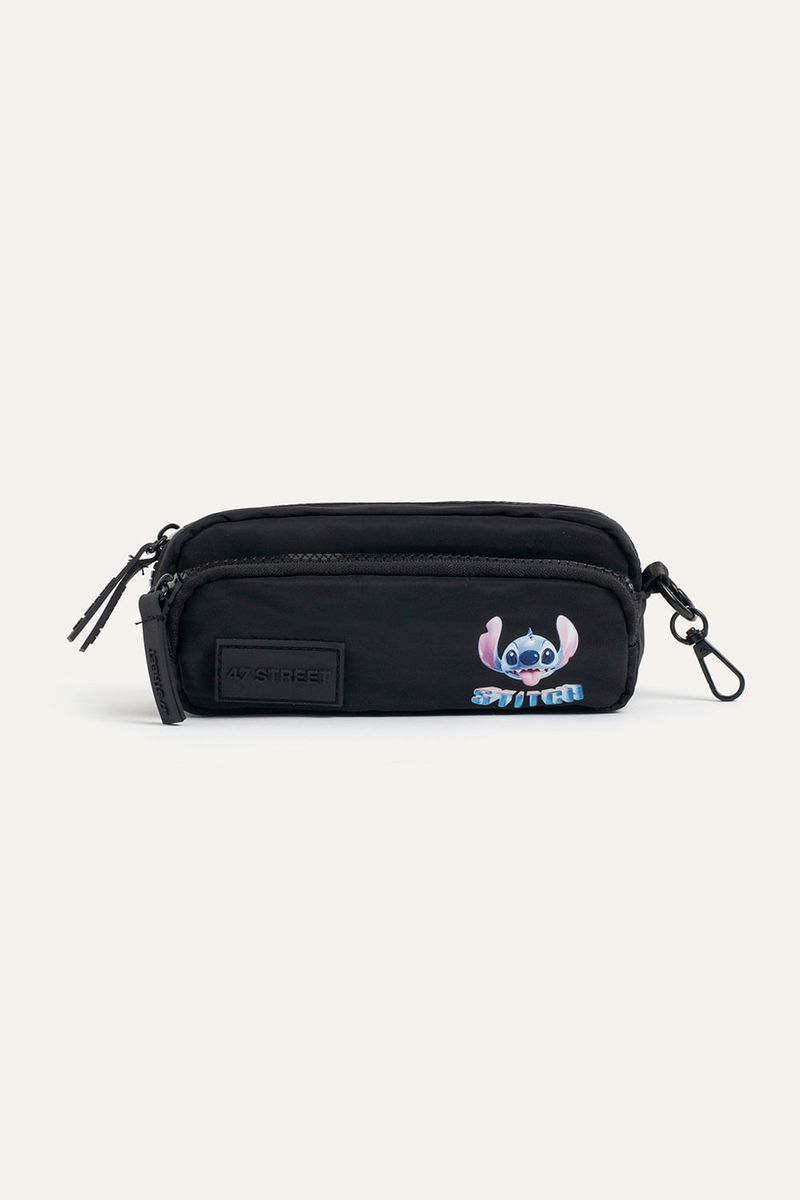 Cartuchera con estampa de Stitch, ideal para organizar útiles de forma práctica. Cuenta con dos compartimentos con cierre y tiracierres personalizados de 47 Street que suman un detalle distintivo. Confeccionada en nylon, material resistente, repelente al agua y de fácil limpieza. Producto con licencia oficial de Disney.