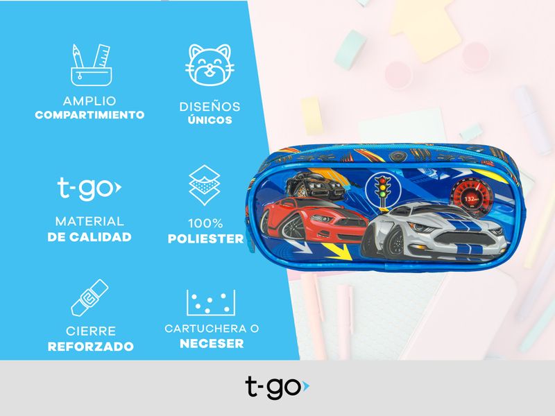 Con las nuevas cartucheras de T-GO todos los útiles escolares viajan seguros y organizados. Son amplias, fabricas con materiales resistentes e increíbles diseños que los más chicos amarán.