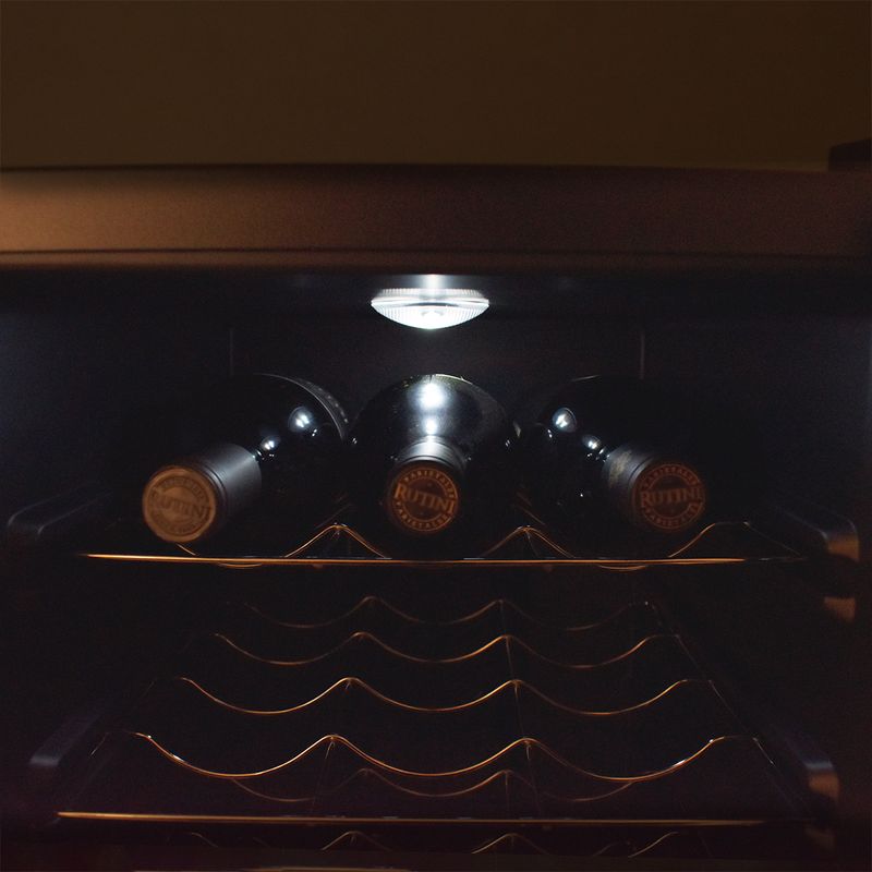 Equipada con estantes de metal resistentes y luz LED interior suave, esta cava no solo asegura la correcta conservación de tus vinos, sino que también agrega un toque sofisticado a tu cocina, living u oficina.
