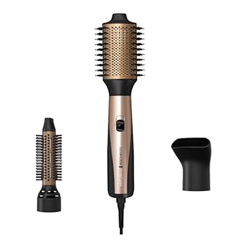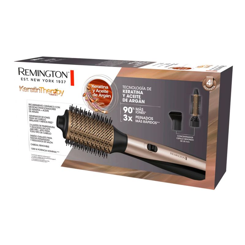 Modelo:AS8821-220A Cepillo de aire Remington con motor de 1 000 W, tecnología iónica antifrizz, barriles intercambiables de 50 mm y 40 mm con recubrimiento de cerámica y queratina, dos velocidades más golpe de aire frío y cable giratorio para moldear y dar volumen con acabado de salón. Color del producto: Negro/Rose Gold. País de origen: China. Garantía: 12 meses.
