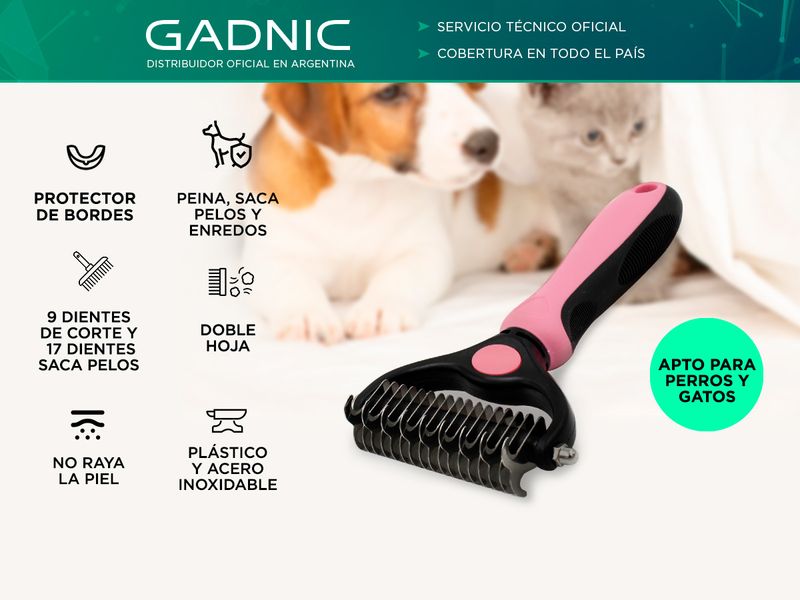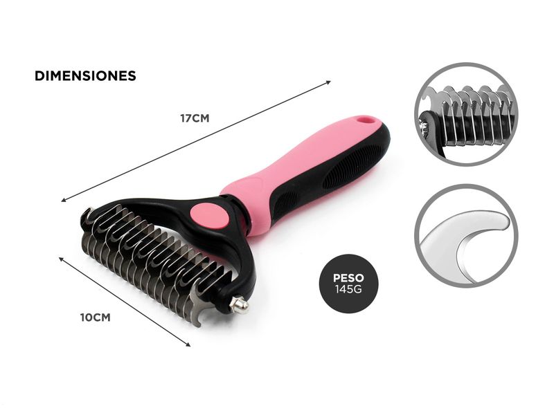 Es tan fácil de usar que puede usarse en peluquerías caninas como en hogares. Posee doble hoja, 9 dientes de corte + 17 de peinado y sacapelos