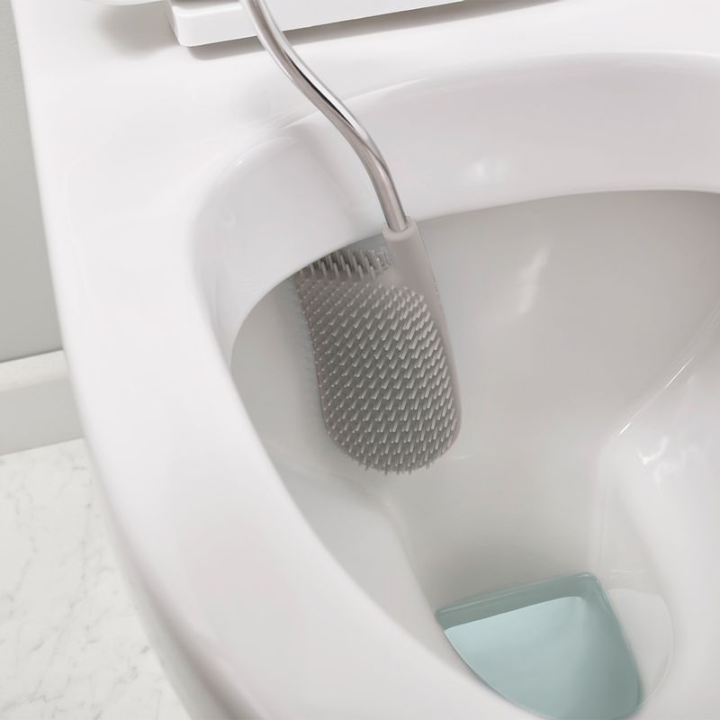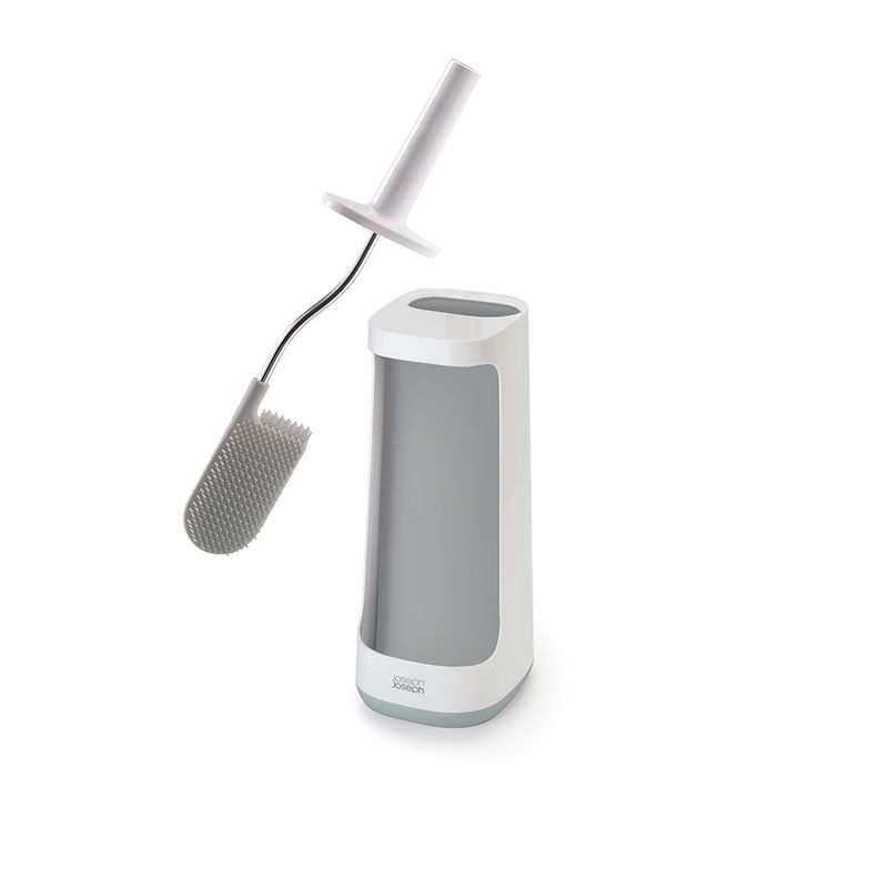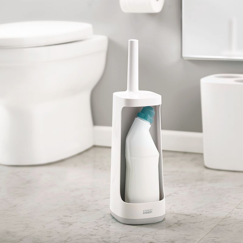 Esta revolucionaria escobilla de baño viene con un práctico carrito para que puedas guardar ordenadamente botellas de lejía o aerosoles fuera de la vista.