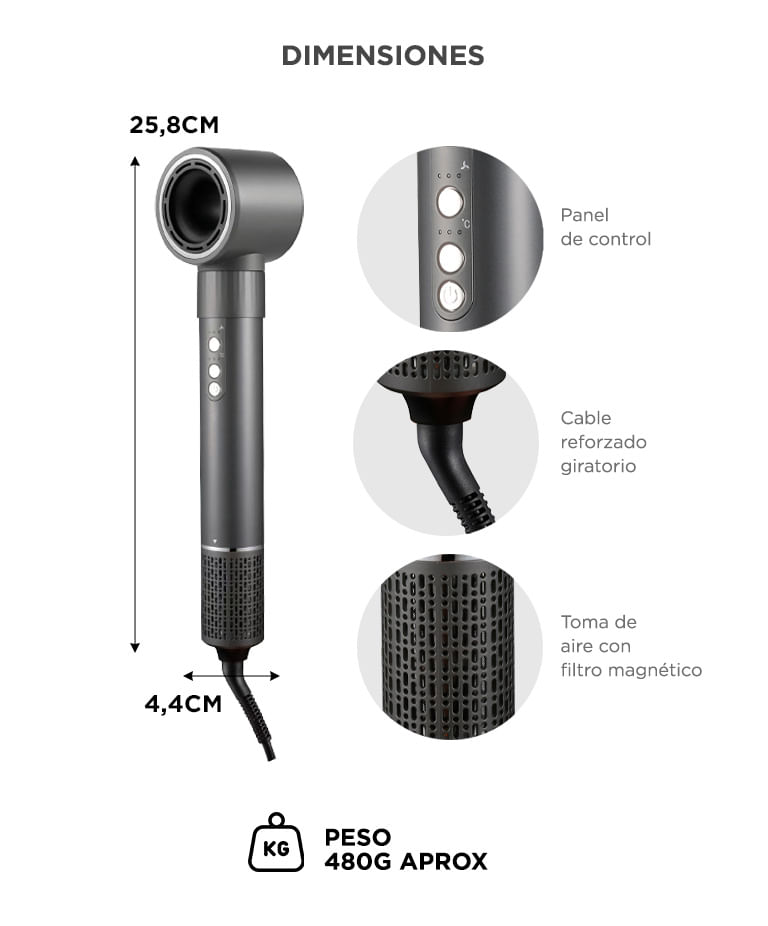 Con 4 niveles de calor y 3 velocidades, se adapta a todo tipo de cabello y estilos.