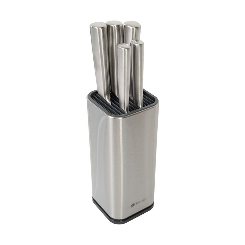 El Cepo de Cuchillos Trento Santoku de 5 piezas es la síntesis perfecta de diseño vanguardista y eficiencia profesional. Este set íntegramente fabricado en metal ofrece una estética ultra moderna y una higiene superior para tu cocina. Las hojas de acero inoxidable AISI 420, con filo liso de alta precisión, se complementan con mangos ergonómicos de acero inoxidable AISI 430, logrando piezas balanceadas y extremadamente duraderas. Incluye un cepo técnico de alta resistencia que combina acero y materiales sintéticos para un almacenamiento seguro y organizado.
