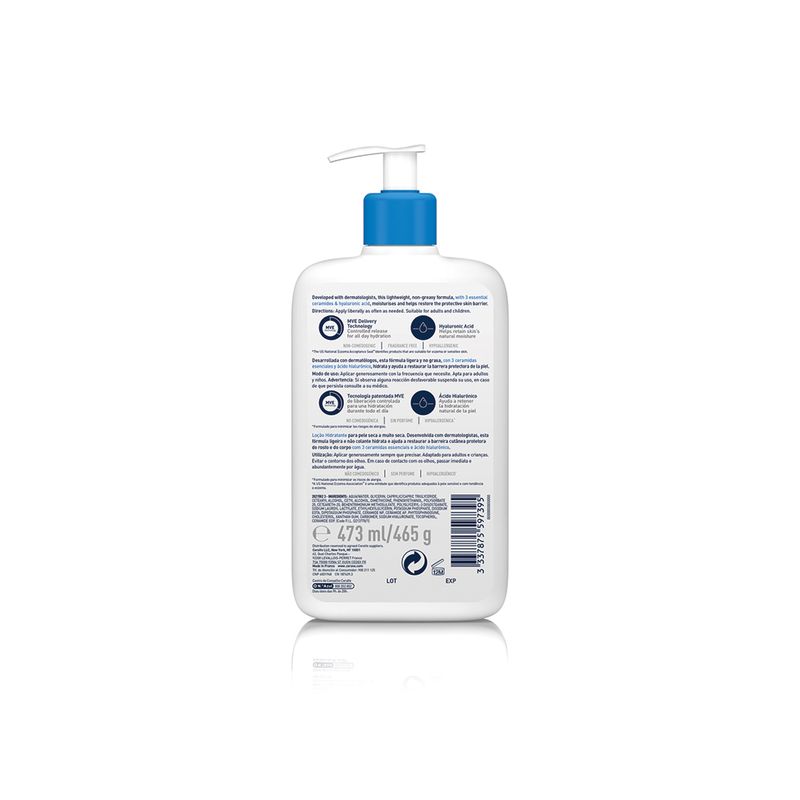 La Loción Hidratante CeraVe para cuerpo y rostro es ideal para pieles sensibles, proporcionando hidratación profunda y restaurando la barrera cutánea natural. Su fórmula enriquecida con ceramidas esenciales y ácido hialurónico ayuda a retener la humedad, dejando la piel suave, calmada y protegida durante todo el día. Esta loción no comedogénica es de rápida absorción, sin sensación grasa, lo que la hace perfecta para usar en piel seca y sensible, tanto en el rostro como en el cuerpo.