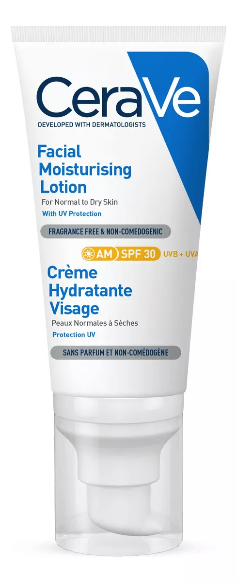 Desarrollado con dermatólogos, Cerave Loción Hidratante Rostro FPS 30 con Protección UVA y UVB, se aplica fácilmente, dejando una piel suave, ayudando a restaurar la barrera protectora de la piel.