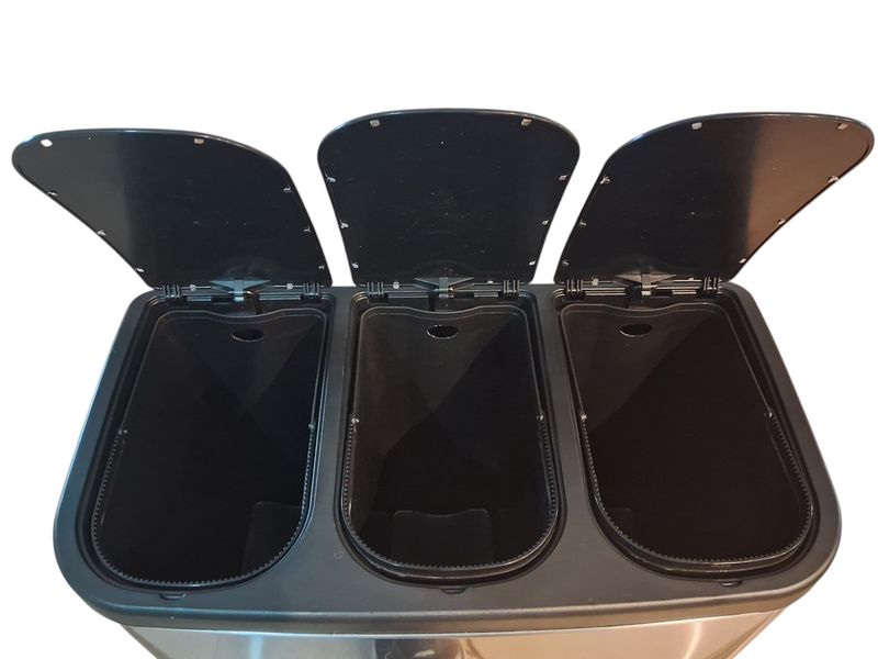 El cesto de basura RM226 de 45 litros está pensado para facilitar la separación de residuos en el hogar. Fabricado en acero inoxidable, cuenta con sistema de triple pedal que permite un uso cómodo e higiénico, ideal para cocina, quincho o espacios donde se requiere mayor organización.