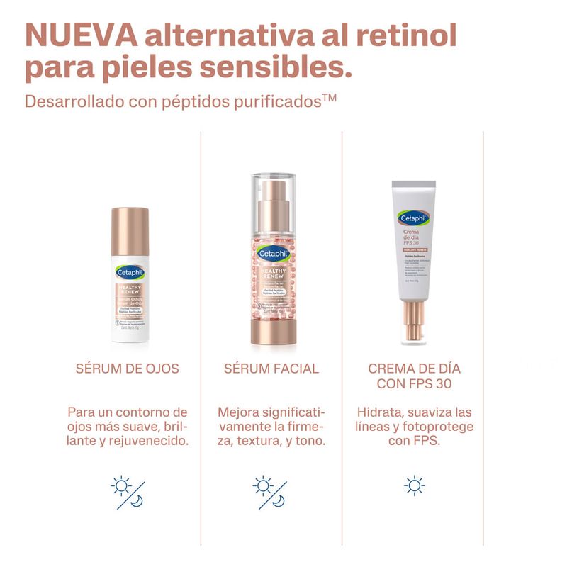 La Crema de Día Hidratante Cetaphil Healthy Renew combina una hidratación intensa con protección solar de amplio espectro SPF 30, ayudando a prevenir los signos del envejecimiento prematuro causados por los rayos UVA/UVB y los radicales libres. Su fórmula con Péptidos Purificados, Vitaminas B3 y B5 y Extractos Botánicos actúa como una alternativa más suave al retinol, ideal para pieles sensibles.