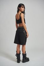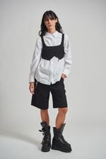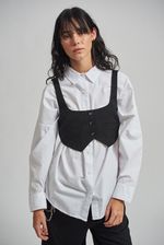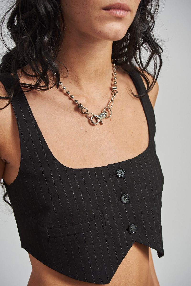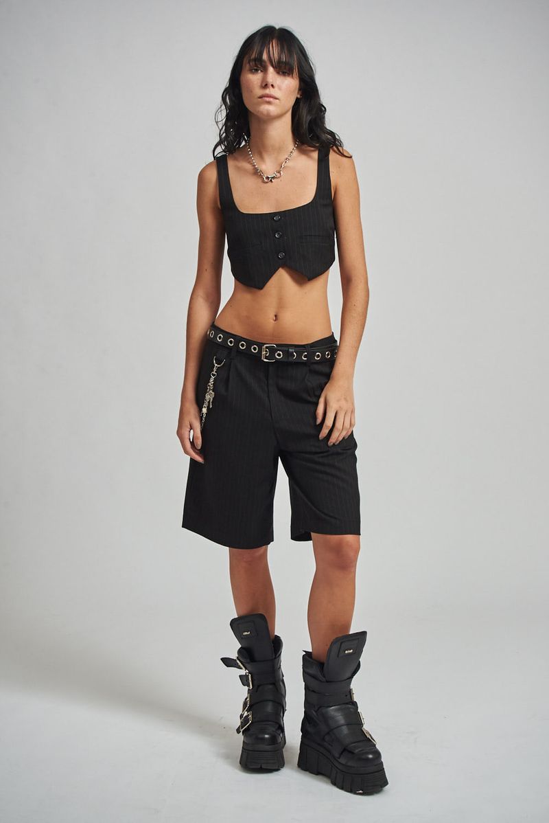 Chaleco extra corto sastrero, en textil rayado tizado, con botones en centro delantero, y vistas de bolsillos.