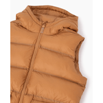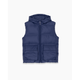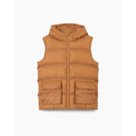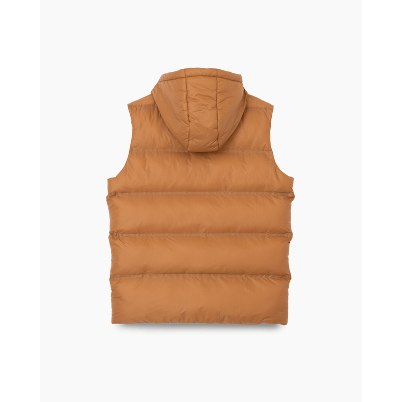 Chaleco con capucha confeccionado en nylon con guata interna puesta a mano. Posee bolsillos con tapa en delanteros que esconden un bolsillo interno lateral.