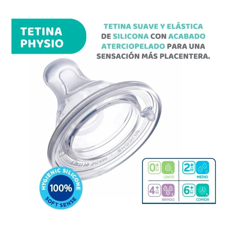 TETINA PHYSIO de silicona 4m+ flujo rápido para una prendida perfecta que acompaña el movimiento natural de la lengua.