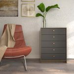 El cuerpo del chifonier está fabricado en MDP revestido en melamina, lo que asegura resistencia y fácil mantenimiento.